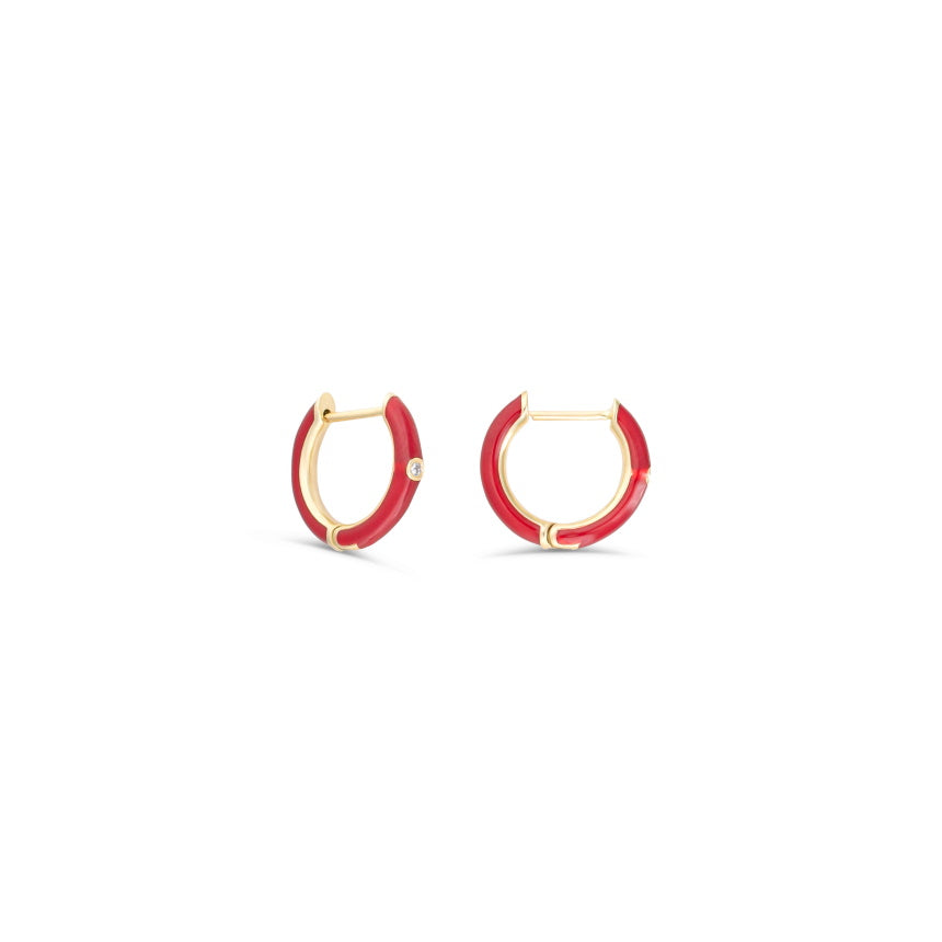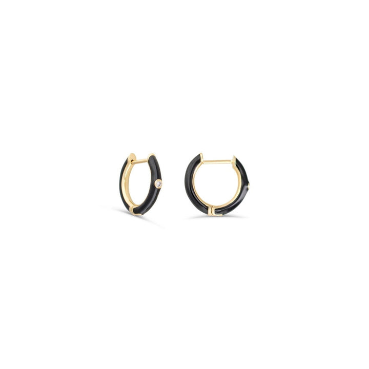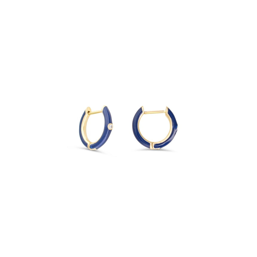 Made in 14K solid gold (yellow, white, or rose) with round bezel-set natural diamonds totaling 0.02 carats per pair. Available in blue, white, red, or black enamel. Wire closure.