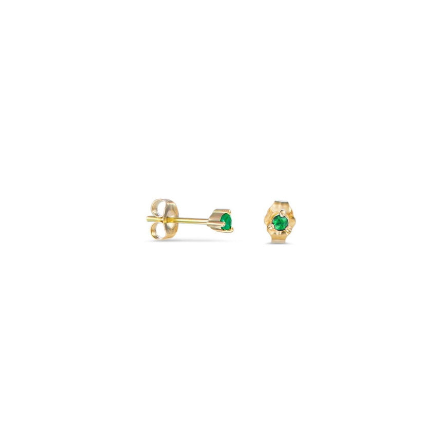 Made from 14K solid gold (yellow, white, or rose) with round-cut natural emeralds measuring 2mm, totaling 0.12 carats per pair. Prong set. Push-back closures.