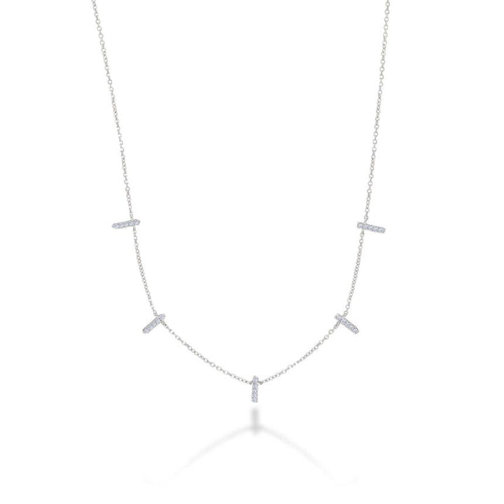 Made in 14K solid gold (yellow, white, or rose). Bar set with .15 carats total of diamonds. 16' chain with a jump ring at 15'.