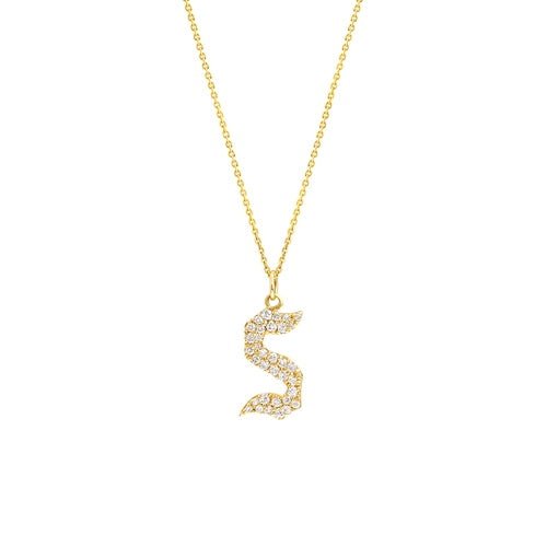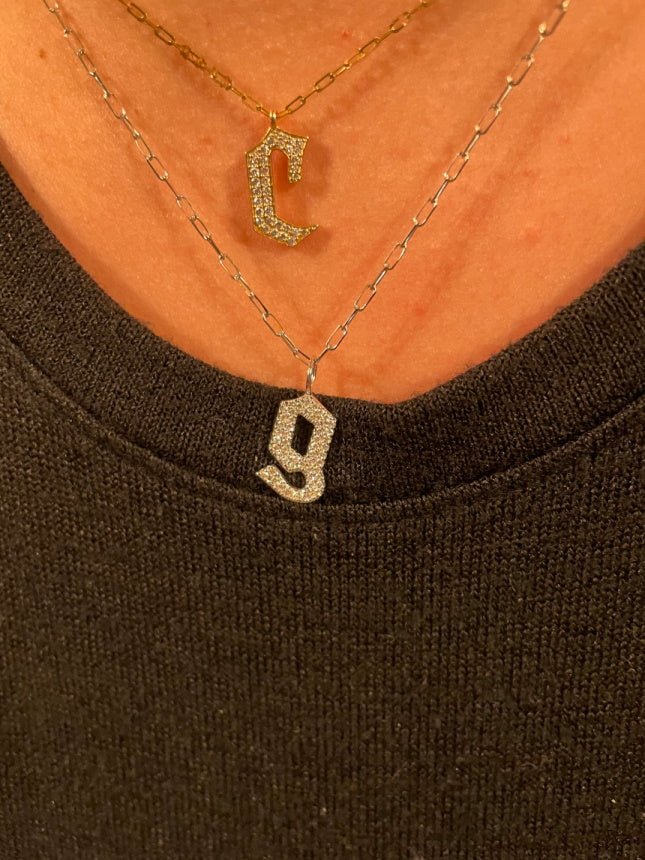 Handcrafted in 14K solid gold (yellow, white, or rose) with pavé-set natural diamonds. Initial size approx. 15mm; carat weight approx. .3 cttw (varies by letter). Includes a 17' chain with a loop at 16'.