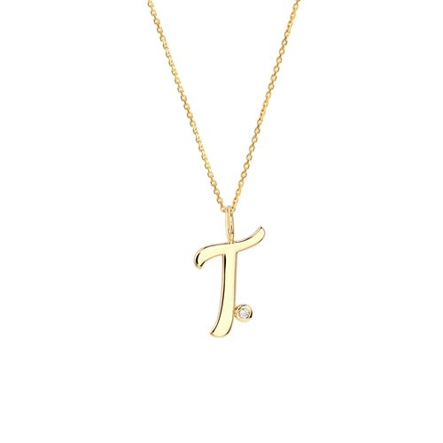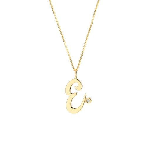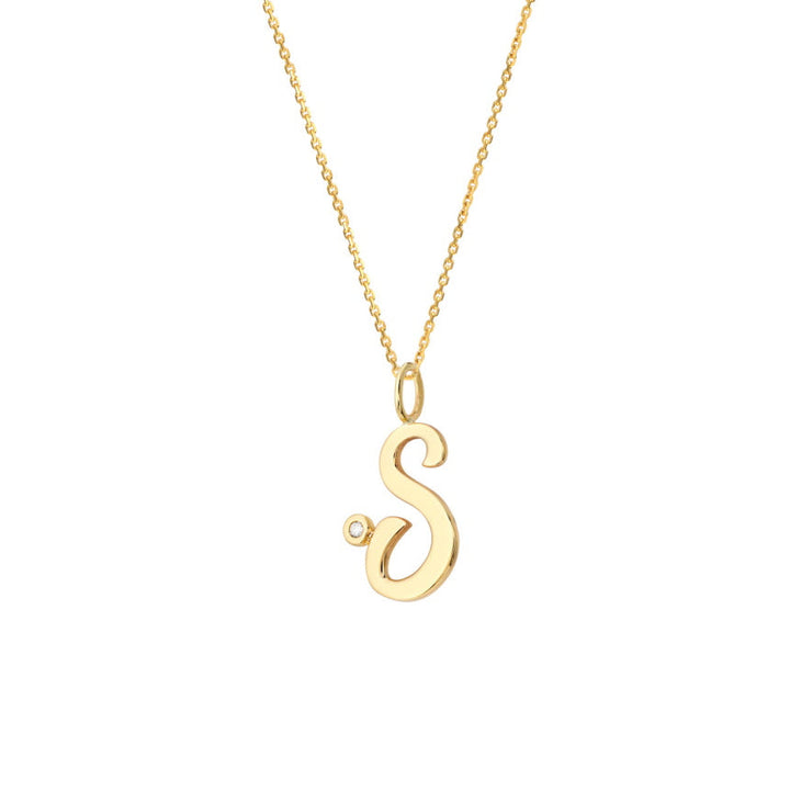 Handcrafted in 14K solid gold (yellow, white, or rose) with natural diamond accent. Initial approx. 15mm. Cable chain: 17' with a loop at 16'.