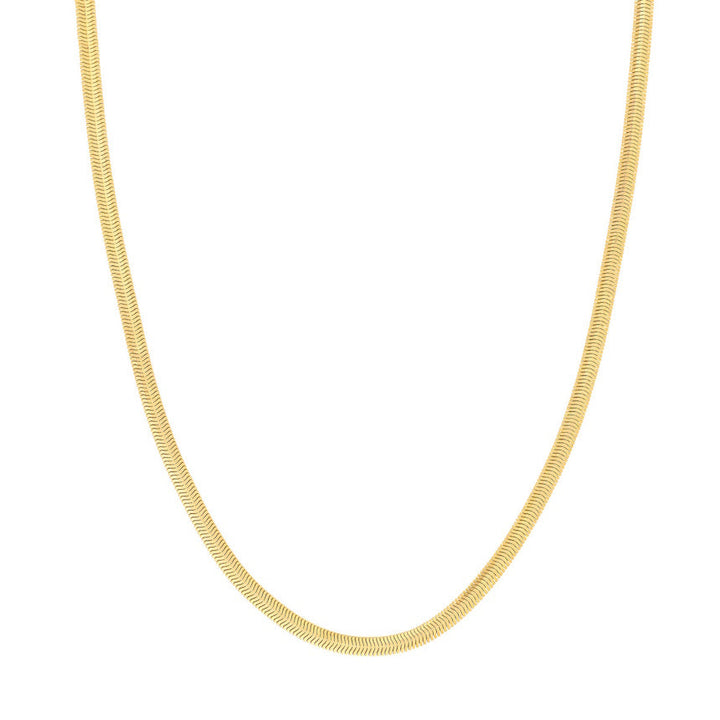 This 18 Inch Gold Snake Chain by Alexis Jae is the ultimate foundation piece. With its smooth, fluid silhouette and diamond-cut shimmer, this hollow snake chain drapes effortlessly along the neckline. Available in two bold widths, it’s ideal for solo wear or layering. A timeless essential with a hint of edge.