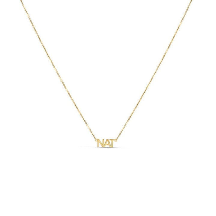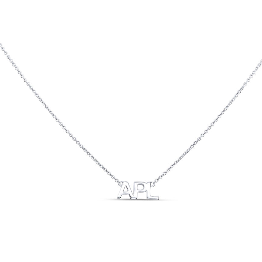 Made from 14K solid gold (yellow, white, or rose), featuring uppercase letters measuring 4.5mm each. Hangs from a 17' cable chain with a loop at 16' for adjustable length.
