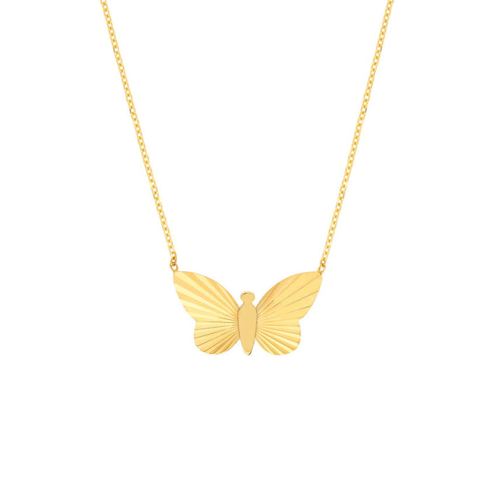 This Big Gold Butterfly Necklace by Alexis Jae invites transformation and grace into your collection. The oversized butterfly charm—symbolizing renewal and personal growth—is designed with delicate fluting for added texture and depth. Its luminous gold surface catches the light with every movement, making it a powerful, symbolic statement piece.