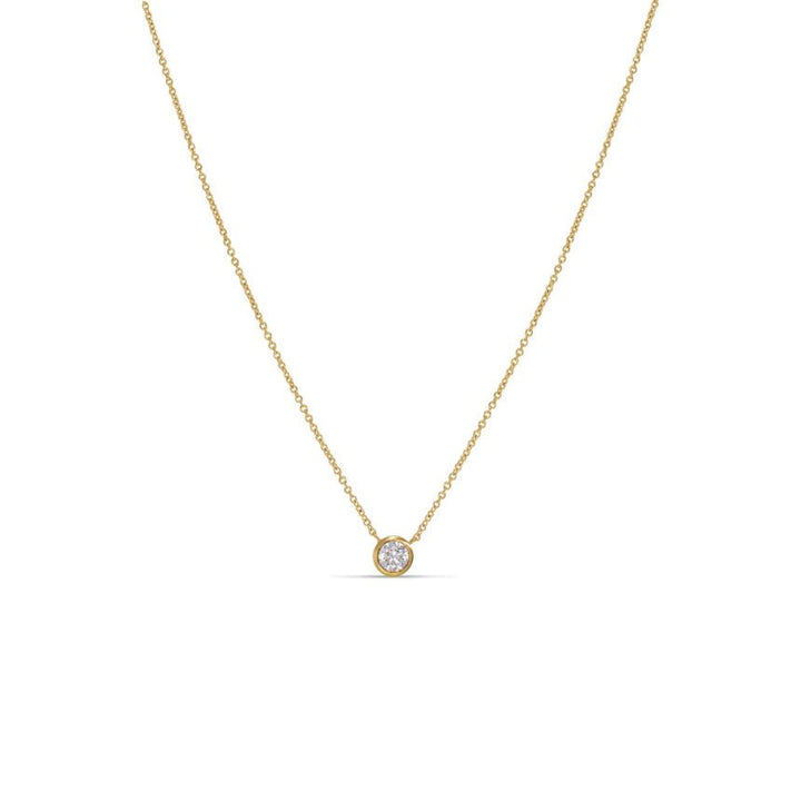 Made from 14K solid gold (yellow, white, or rose), featuring a 0.4 carat round-cut white diamond (GH color, SI1 clarity) in an eyeglass setting. Chain length: 17' with jump ring at 16'.