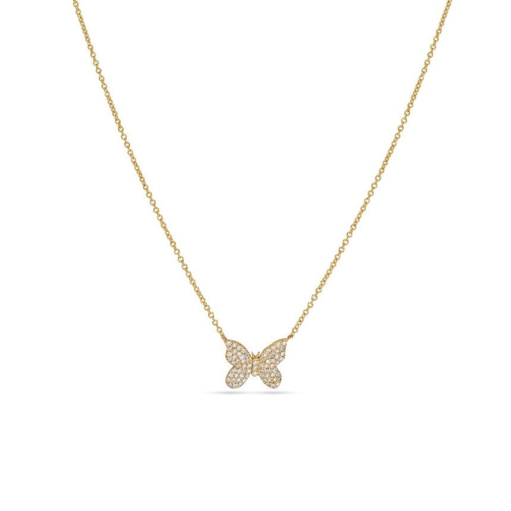 This Pavé Diamond Butterfly Necklace by Alexis Jae flutters with elegance and sparkle. The delicate butterfly pendant, set with glistening round diamonds, is a symbol of transformation, beauty, and freedom. Whether layered or worn alone, this graceful piece adds a feminine flourish to your fine jewelry collection. It’s a dainty yet dazzling tribute to nature’s most enchanting form.