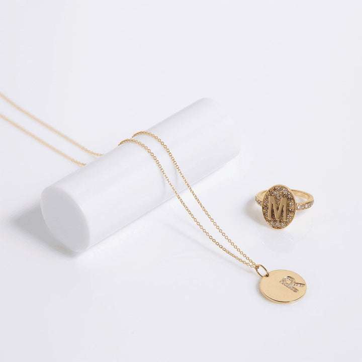 This Gold Disc Necklace With Initial by Alexis Jae is a timeless and personal expression of style. A single gold disc pendant is adorned with a pavé diamond initial of your choice, creating a chic, customized look. Suspended from a delicate cable chain, this piece is ideal for everyday wear or gifting to a loved one.