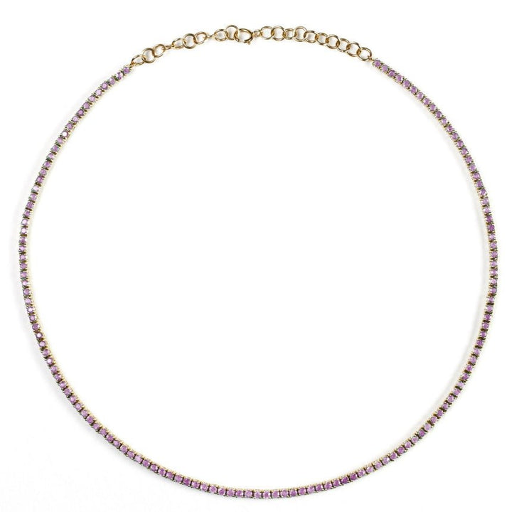 This Pink Sapphire Tennis Necklace by Alexis Jae transforms a timeless style with a fresh burst of color. Round-cut pink sapphires are set in elegant four-prong settings, forming a vibrant strand that radiates femininity and charm. Whether worn as a choker or layered with longer chains, this piece evokes joy and optimism with every wear.