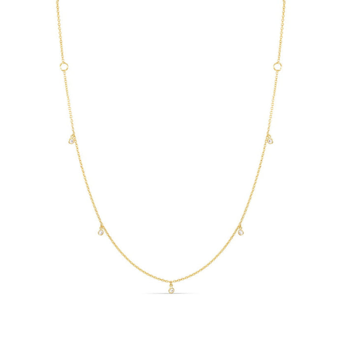 Crafted in 14K solid gold (yellow, white, or rose) with 5 round white diamonds totaling .16 ctw. Bezel set on a 16' cable chain with loops at 14' and 12'. Lobster clasp.
