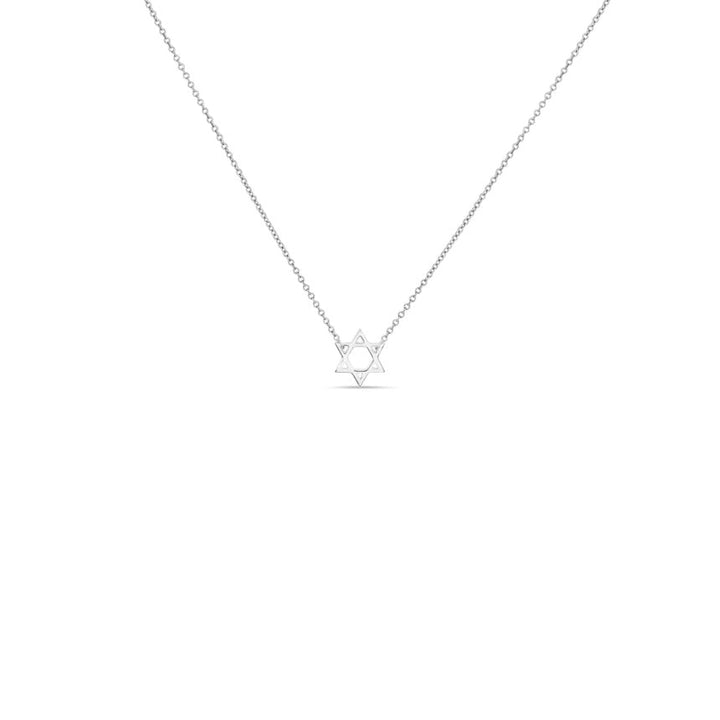 Handcrafted in 14k solid gold (yellow, white, or rose), featuring a 10mm Star of David pendant. Suspended on an 18” cable chain with a 16” jump ring. Spring ring clasp.