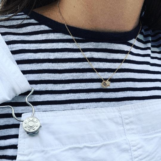 Handcrafted in 14k solid gold (yellow, white, or rose), featuring 0.07 cttw natural white diamonds in a pavé setting. Suspended on an 18” cable chain with a 16” jump ring.