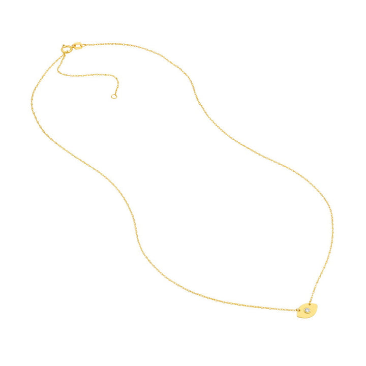 Crafted in 14K solid gold (yellow, white, or rose), featuring a .03 carat natural white diamond in a bezel setting. Suspended on a cable chain measuring 18' with an adjustment jump ring at 16'.