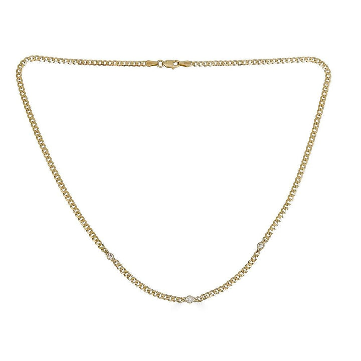 Constructed in 14K gold (yellow or white) with .27 carats of round diamonds (2.9mm each, 3.1mm with bezel). Chain width: 2.7mm. 16' length. Bezel setting with lobster clasp.