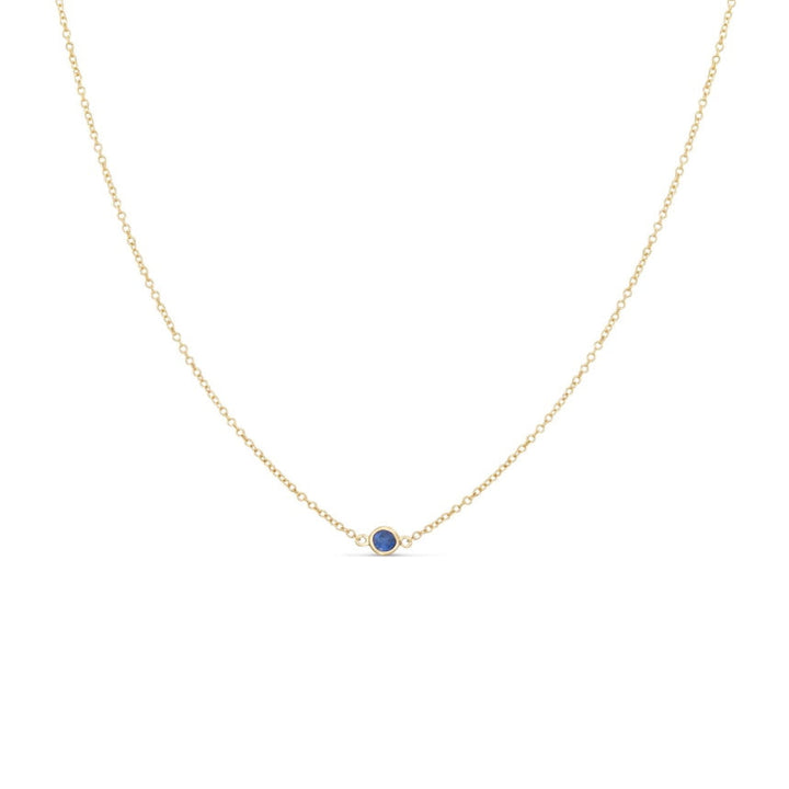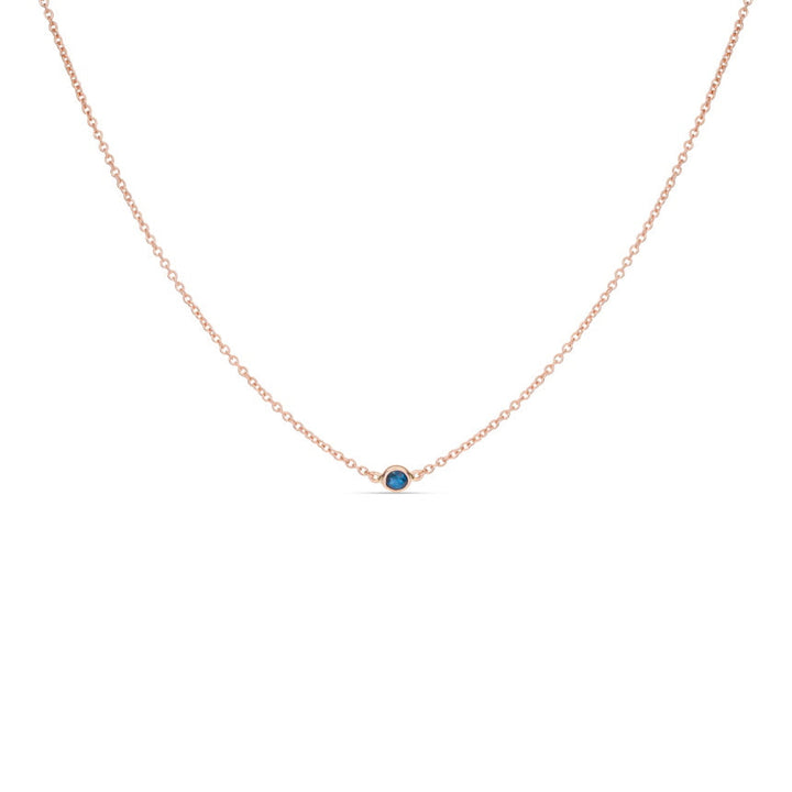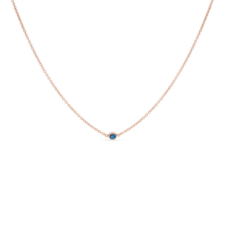 Crafted in 14K solid gold (yellow, white, or rose) with a round-cut natural blue sapphire. Available in .04 or .09 carat total weight. Set in an eyeglass bezel on a 17' cable chain with a 16' adjustment loop. Spring ring clasp.