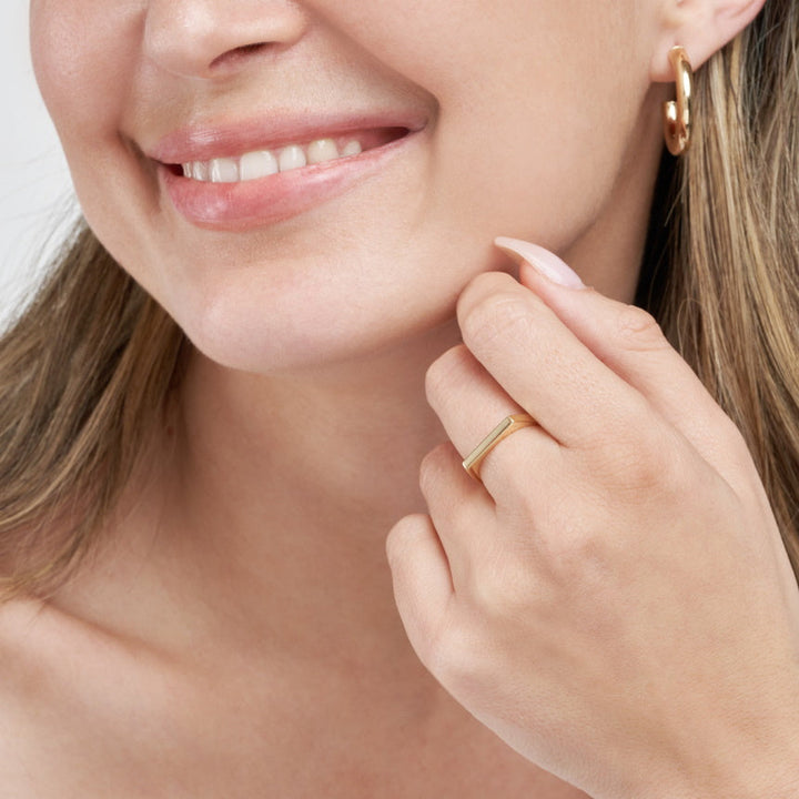 This Skinny Signet Ring by Alexis Jae brings a refined, contemporary take to a heritage silhouette. With its slim rectangular face and clean lines, it’s a minimalist staple ready for engraving. Whether worn solo or stacked, this piece offers an effortless balance of individuality and timeless appeal.