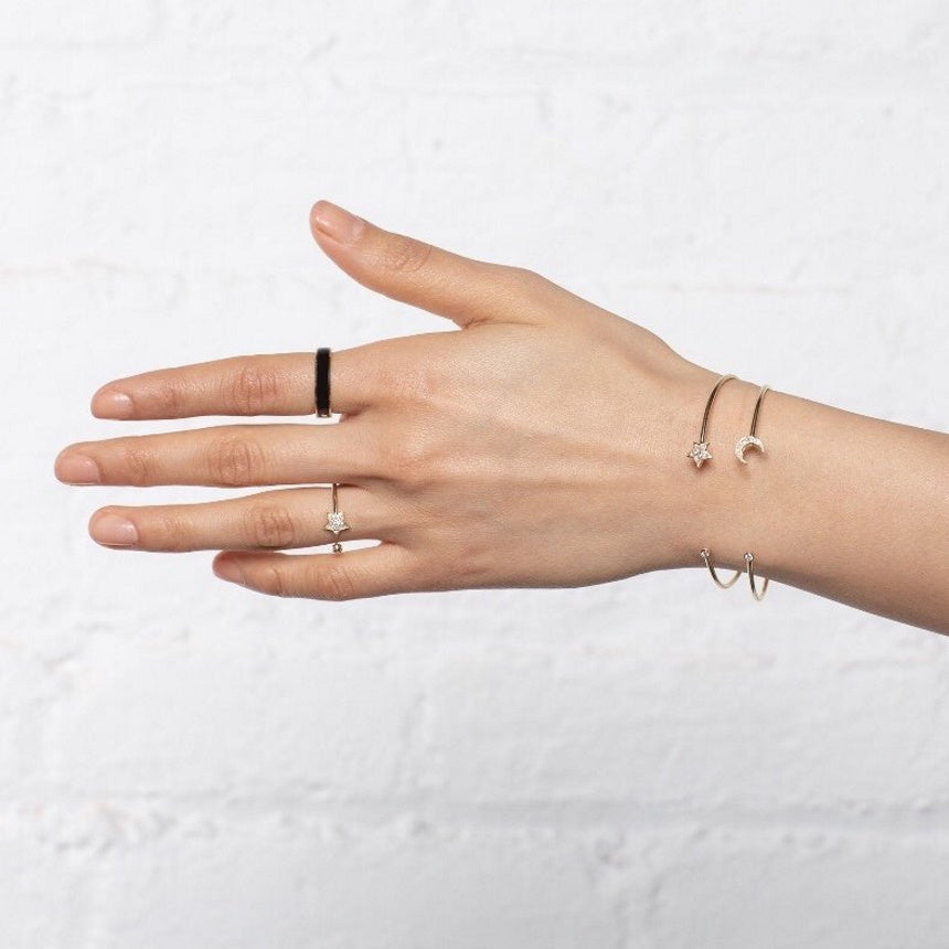 This Celestial Wedding Band by Alexis Jae is where the cosmos meets couture. Featuring golden moon and star motifs set against bold black enamel, this ring is a wearable universe. Whether stacked or worn alone, it adds mystique and romance to any jewelry ensemble.