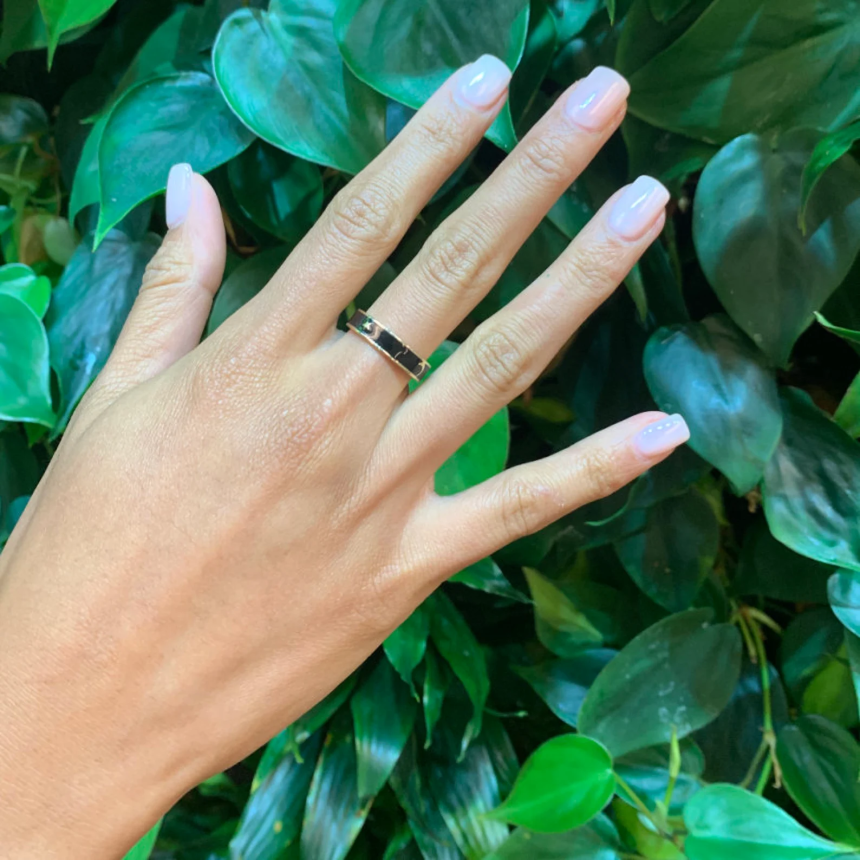 Handcrafted in 14k solid gold (yellow, white, or rose gold) with black enamel. Available in sizes 3–9.