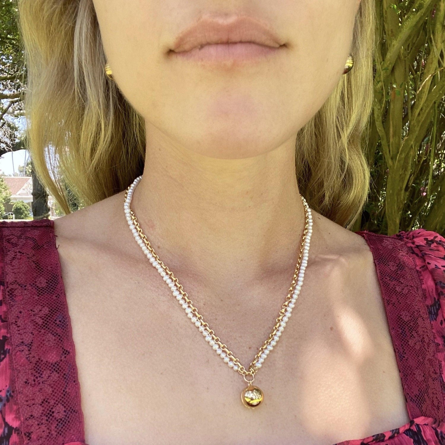 Sphere charm in ethically mined 23.5-karat yellow gold premium plating over recycled brass. Chain in thick-bond yellow gold over recycled brass (gold-filled). 18' chain length. Hand-selected freshwater pearls.