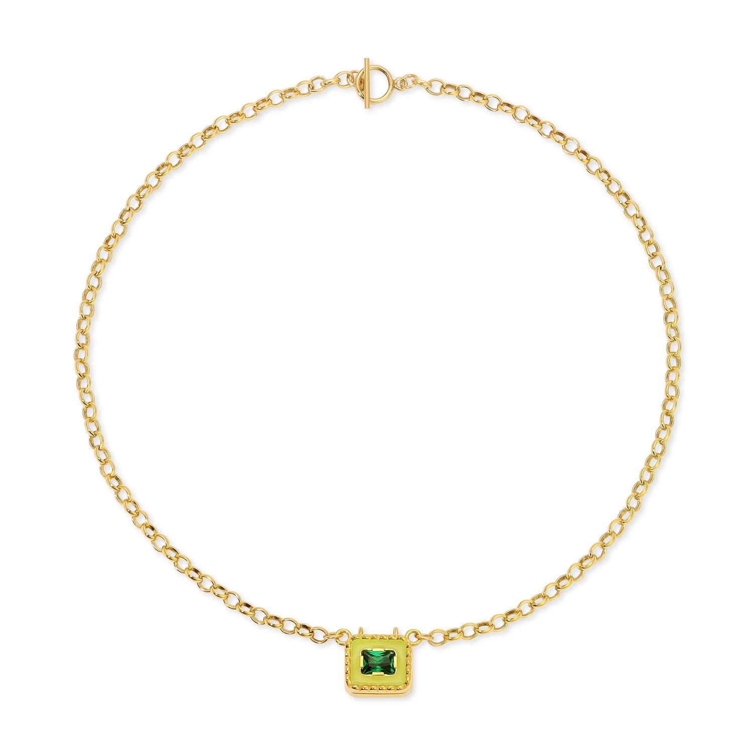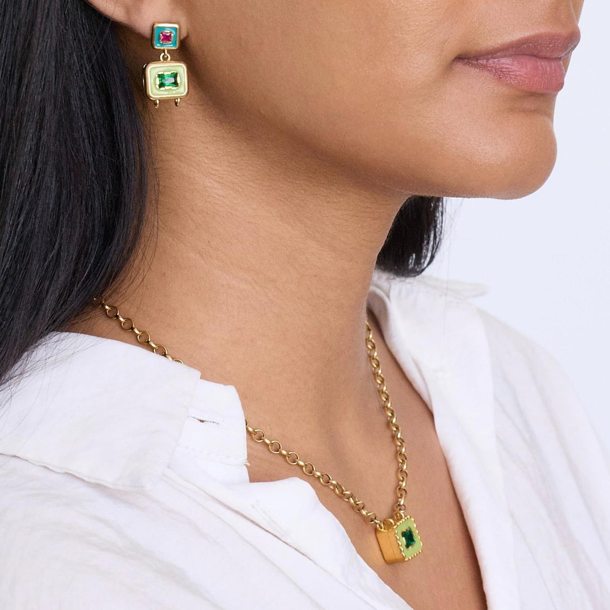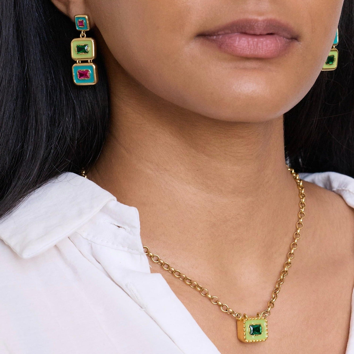 Made of ethically mined 23.5-karat yellow gold premium plating over recycled brass with colored enamel and lab-grown stones. Gold-filled chain. 16' length. Includes Japanese paper scroll and internal heart engraving.