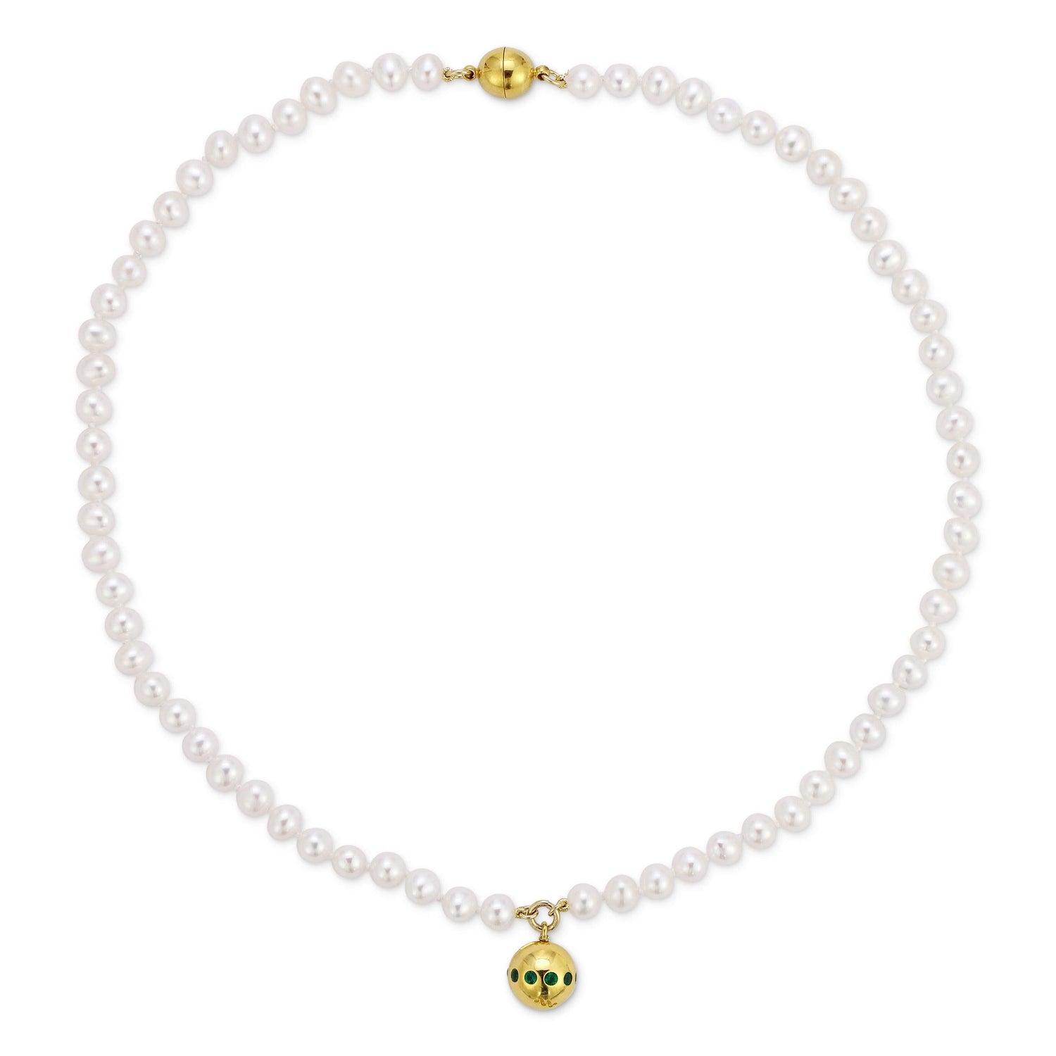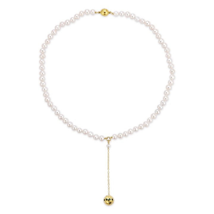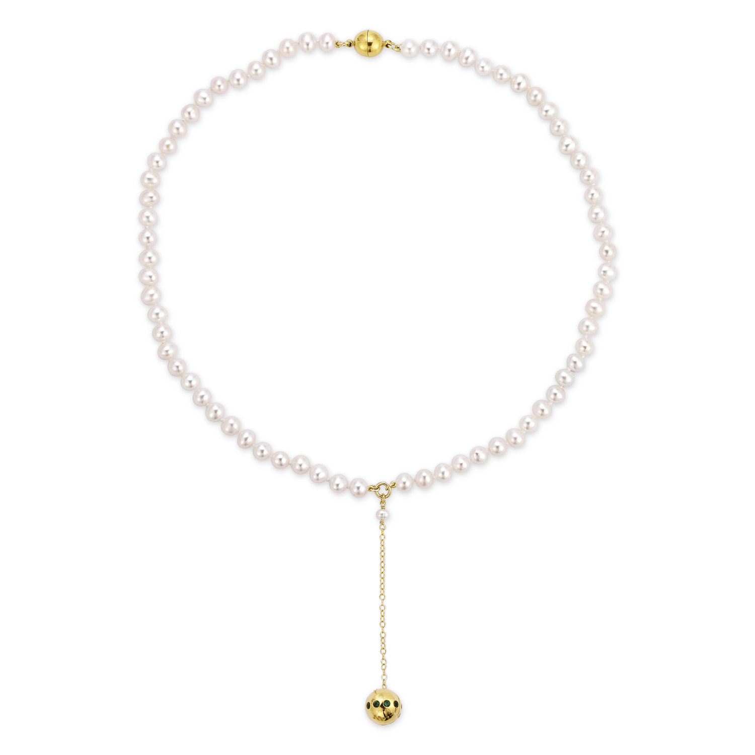 Made of ethically mined 24-karat yellow gold premium plating over recycled brass with white freshwater pearls. 16' necklace length. Magnetic clasp.