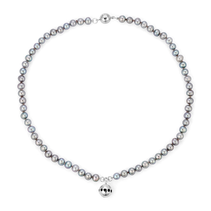Sphere charm in recycled sterling silver. Large pea-sized freshwater pearls. 16' necklace length. Magnetic clasp. Patented design.