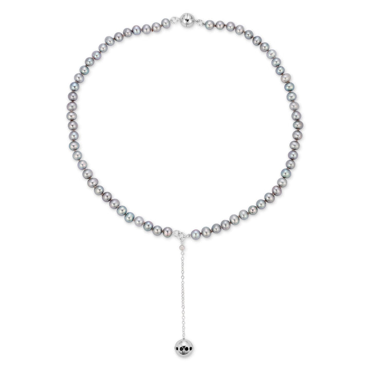 This Nuni Noir Necklace by Monbouquette plays with contrast through rich gray pearls and dark-set stones within a sleek silver sphere. Convertible for dual styling, it’s a striking, modern twist on traditional pearl jewelry—perfect for night-to-day versatility with edge.