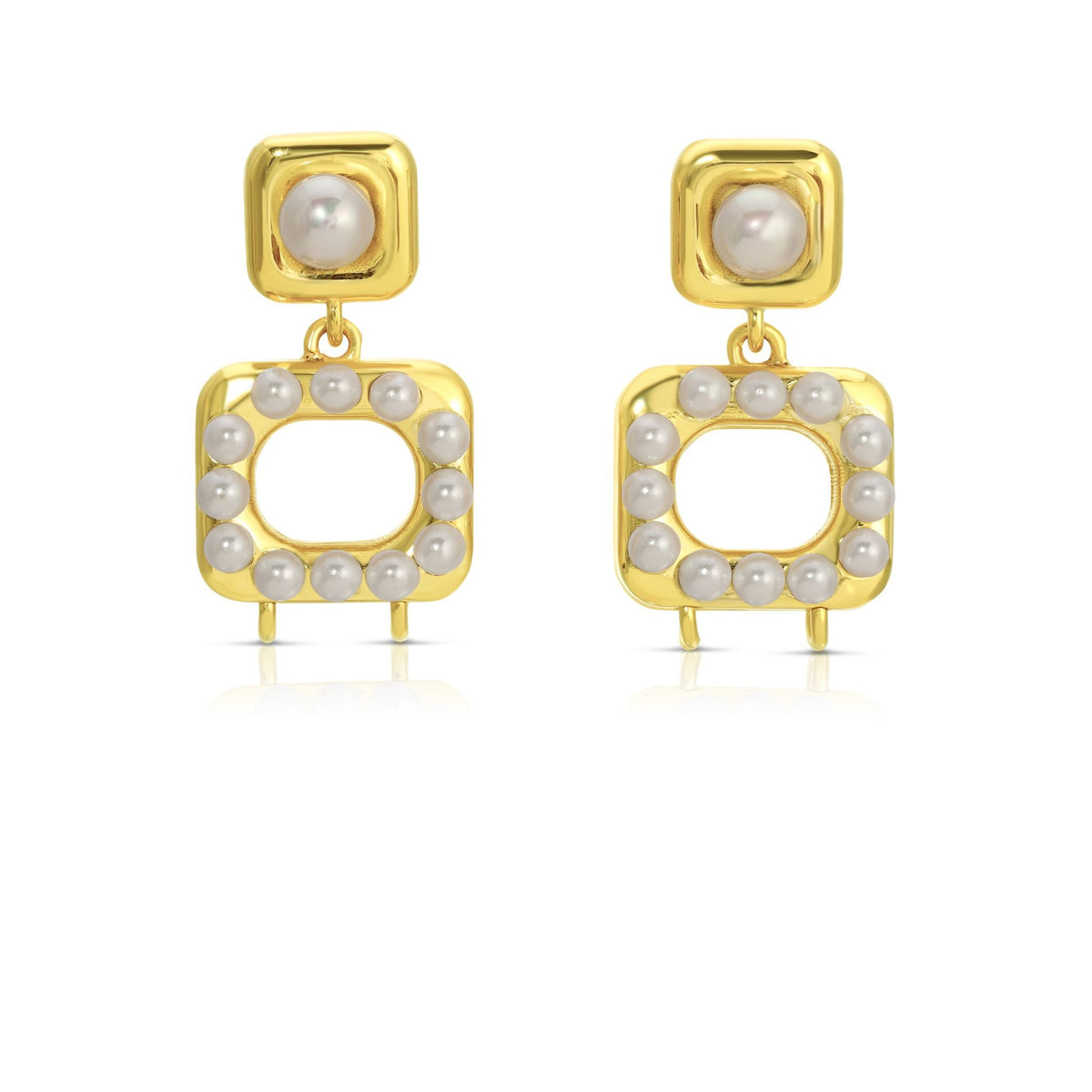 Materials: Ethically mined 23.5-karat yellow gold premium plating. Accented with white seed pearls. Convertible hoop design. Patent pending.