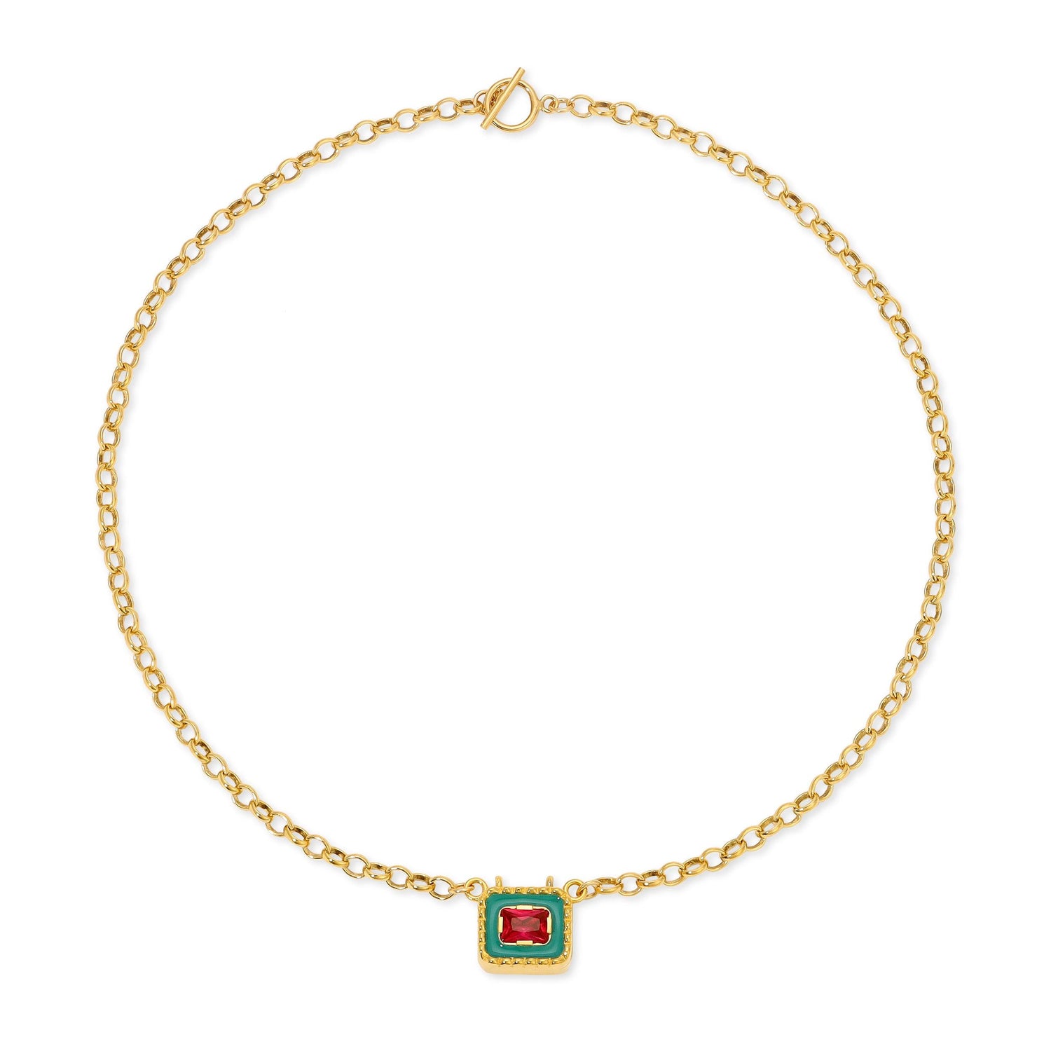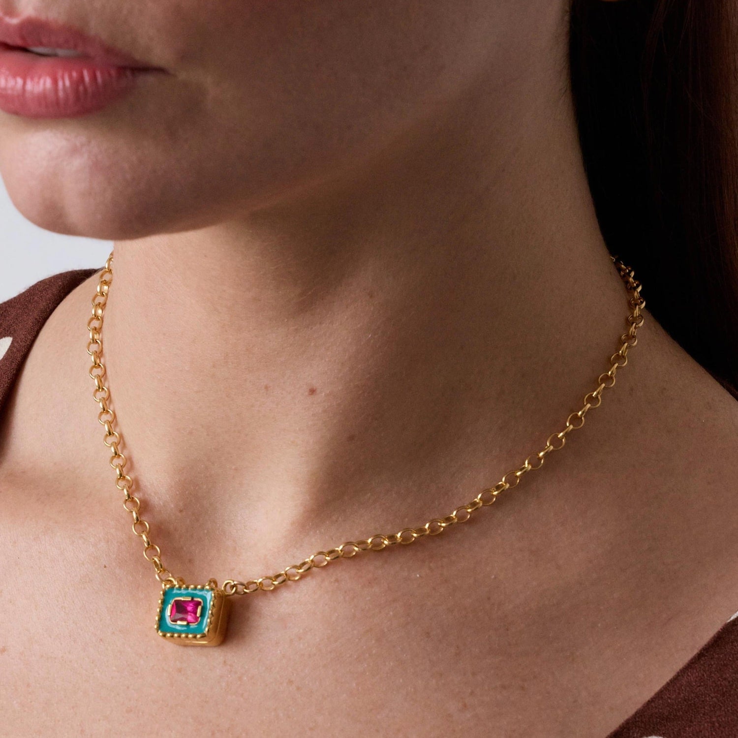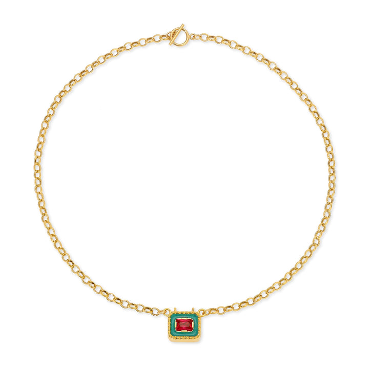 Materials: Ethically mined 23.5-karat yellow gold premium plating over recycled brass with colored enamel and lab-grown stones. 16' gold-filled chain over recycled brass.