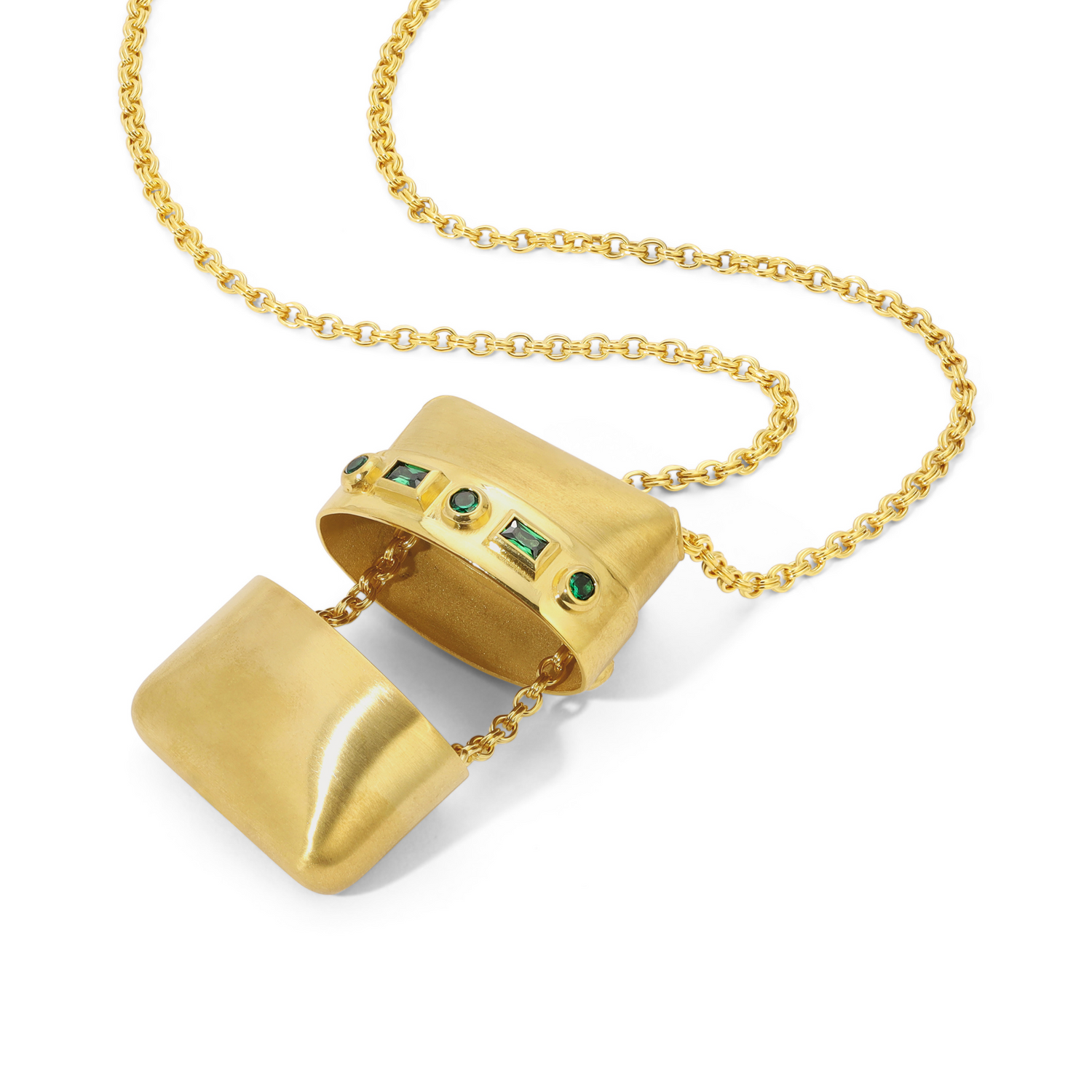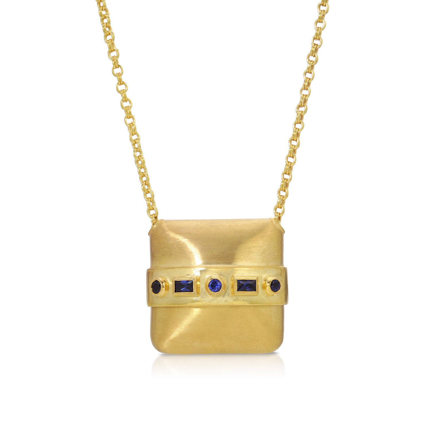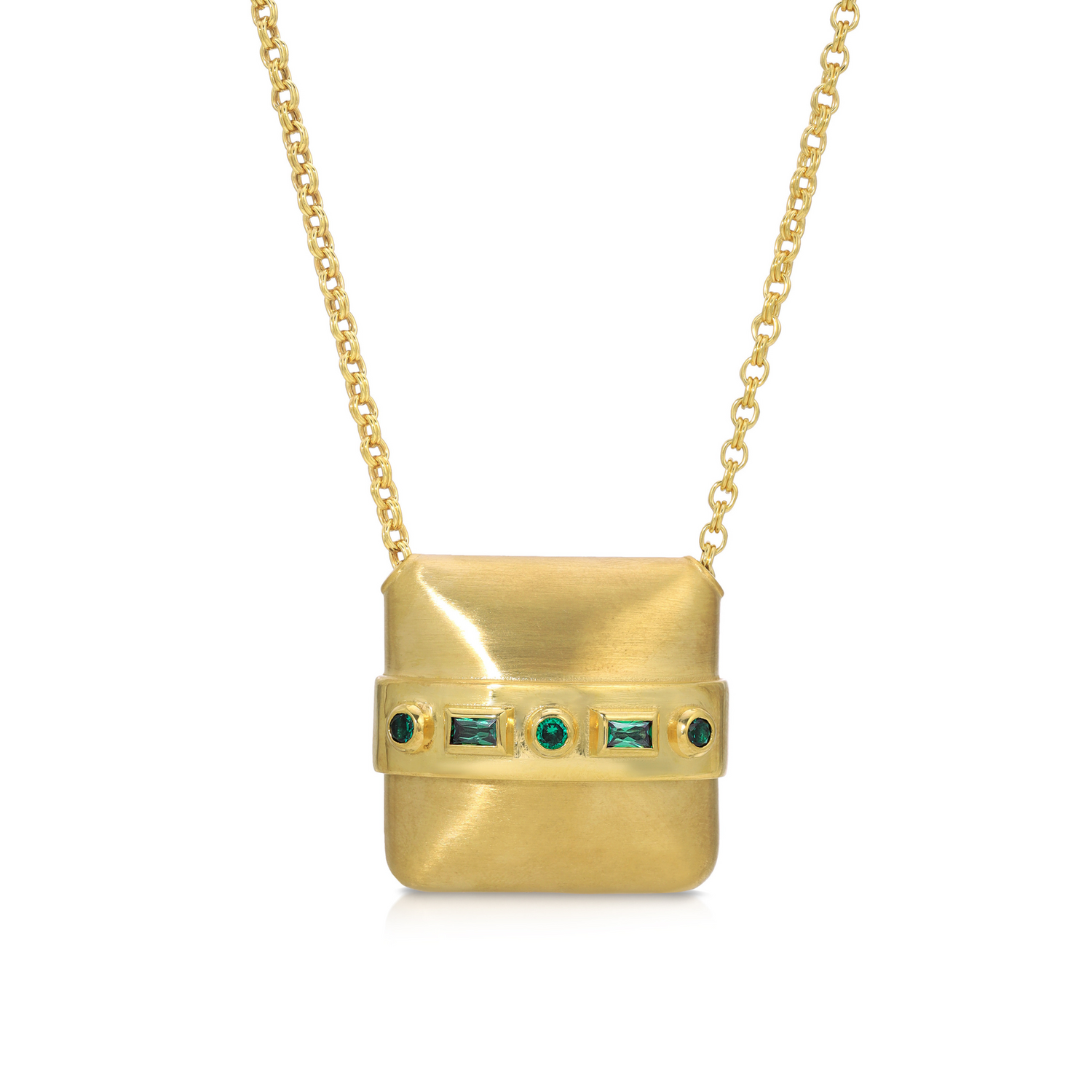 Style Notes: This Pillow Pendant by Monbouquette Jewelry is a luxurious capsule of mystery. Boldly shaped like a miniature pillow, it features a hidden compartment meant to safeguard a secret token or talisman close to your heart. The polished finish is elevated by the shimmer of lab-grown emerald and sapphire stones, making it a timeless piece with storytelling depth.
