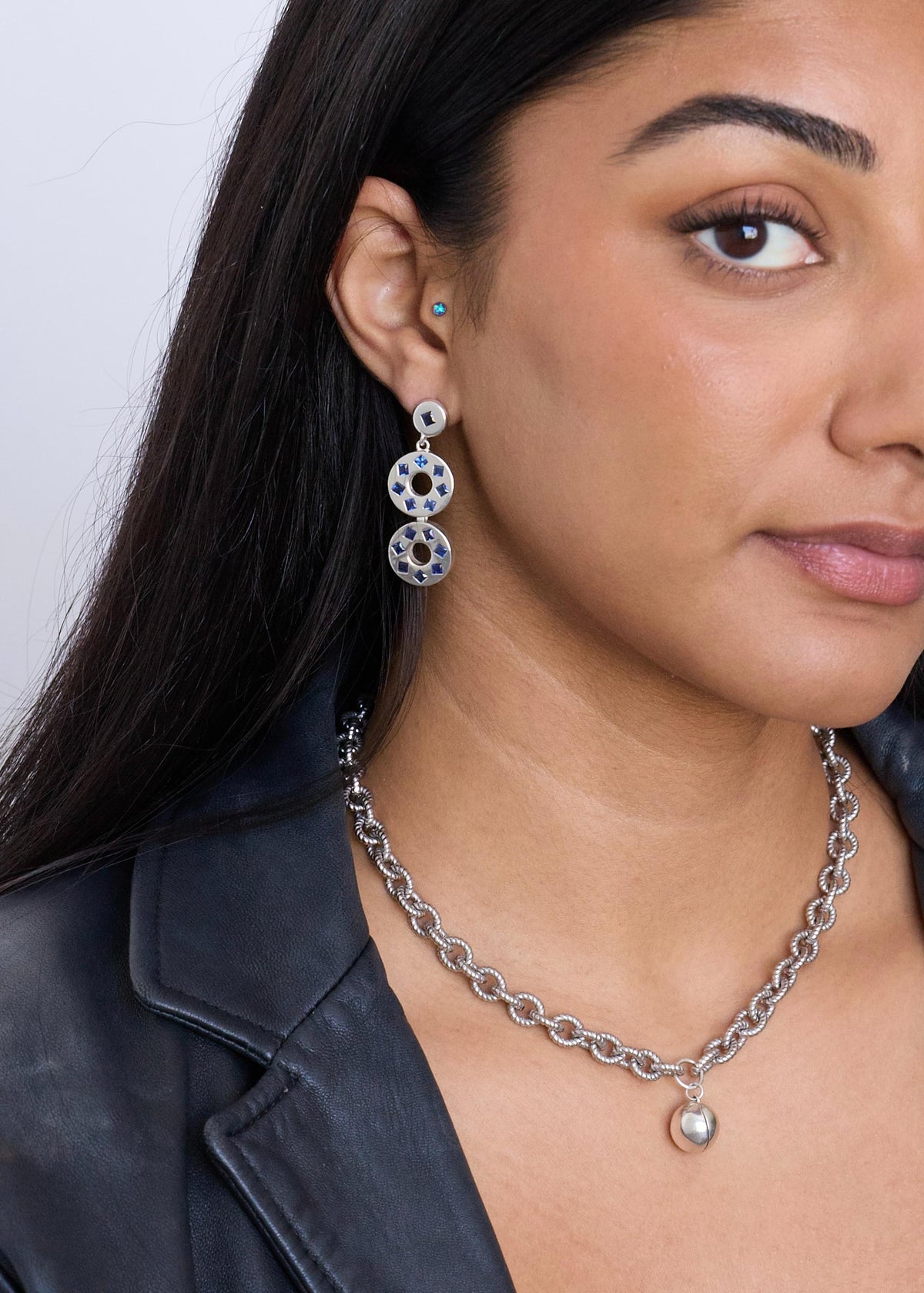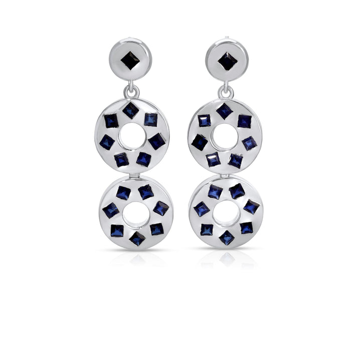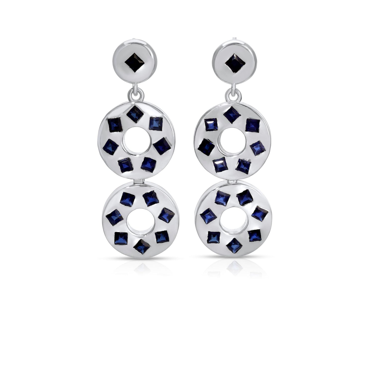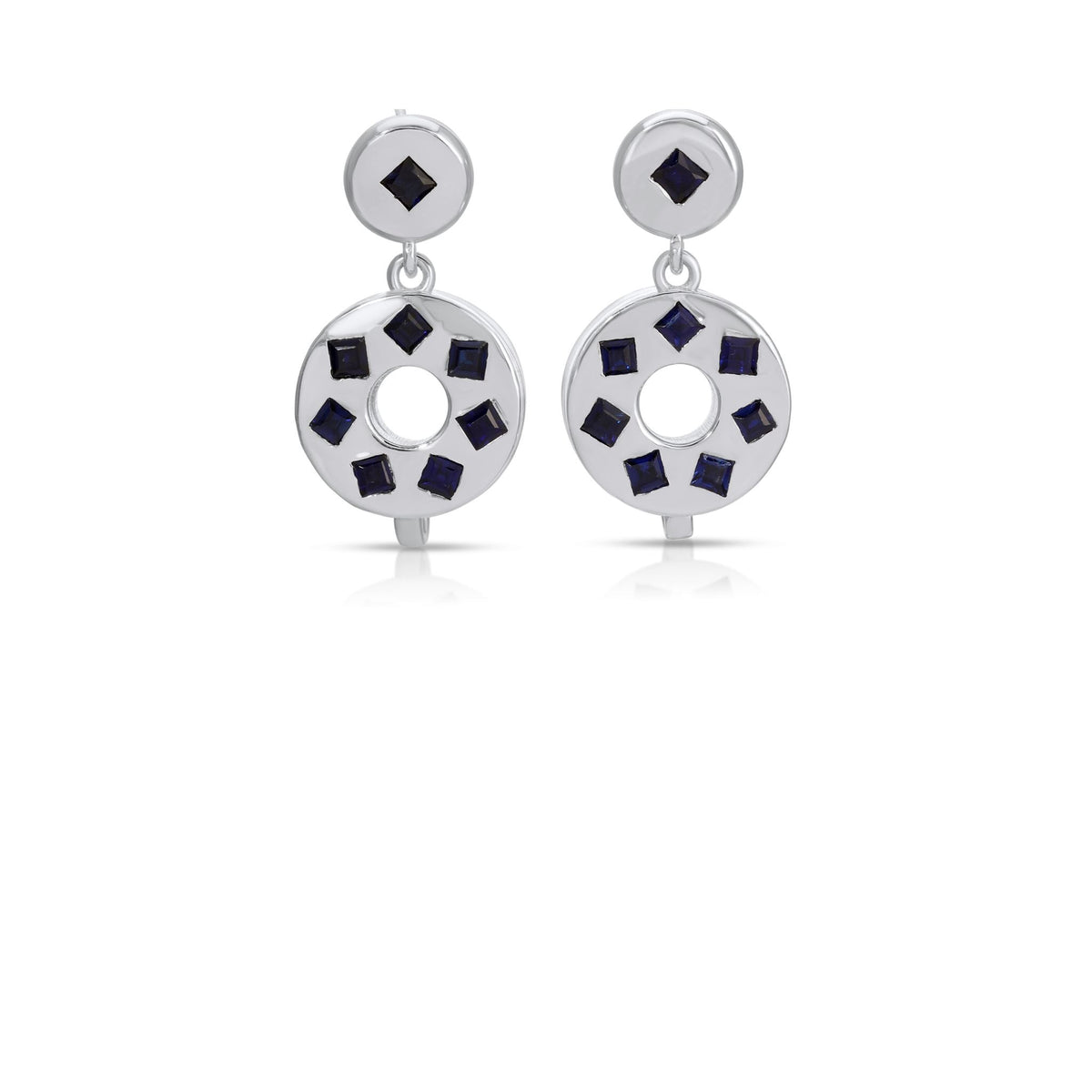 Materials: Made of recycled sterling silver with lab-grown sapphire stones. Lightweight and patent pending.