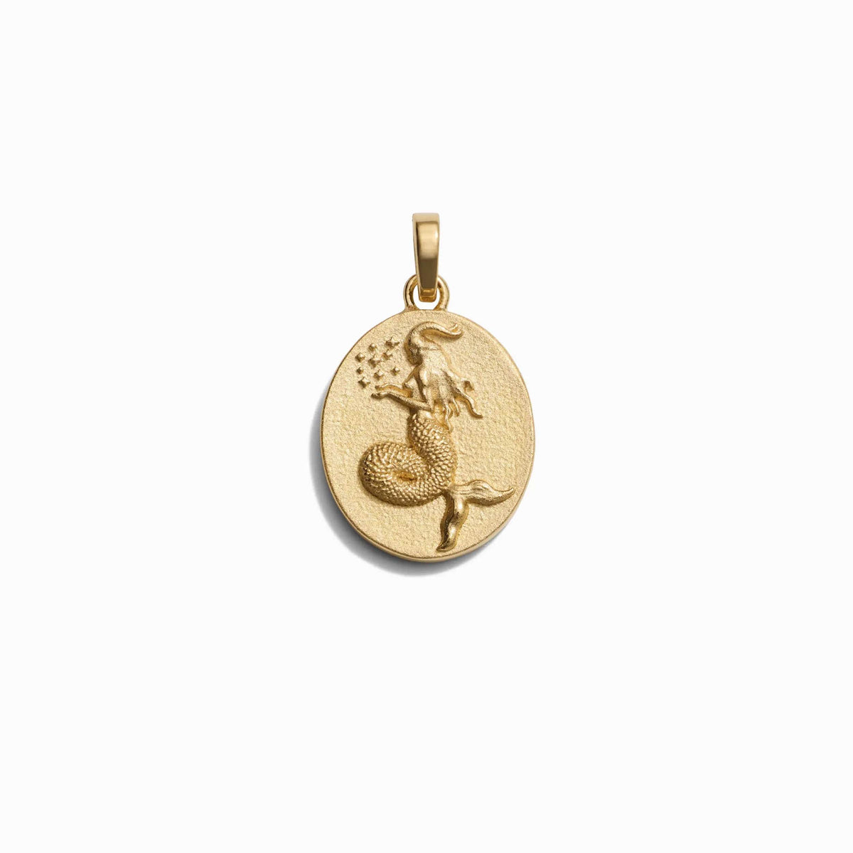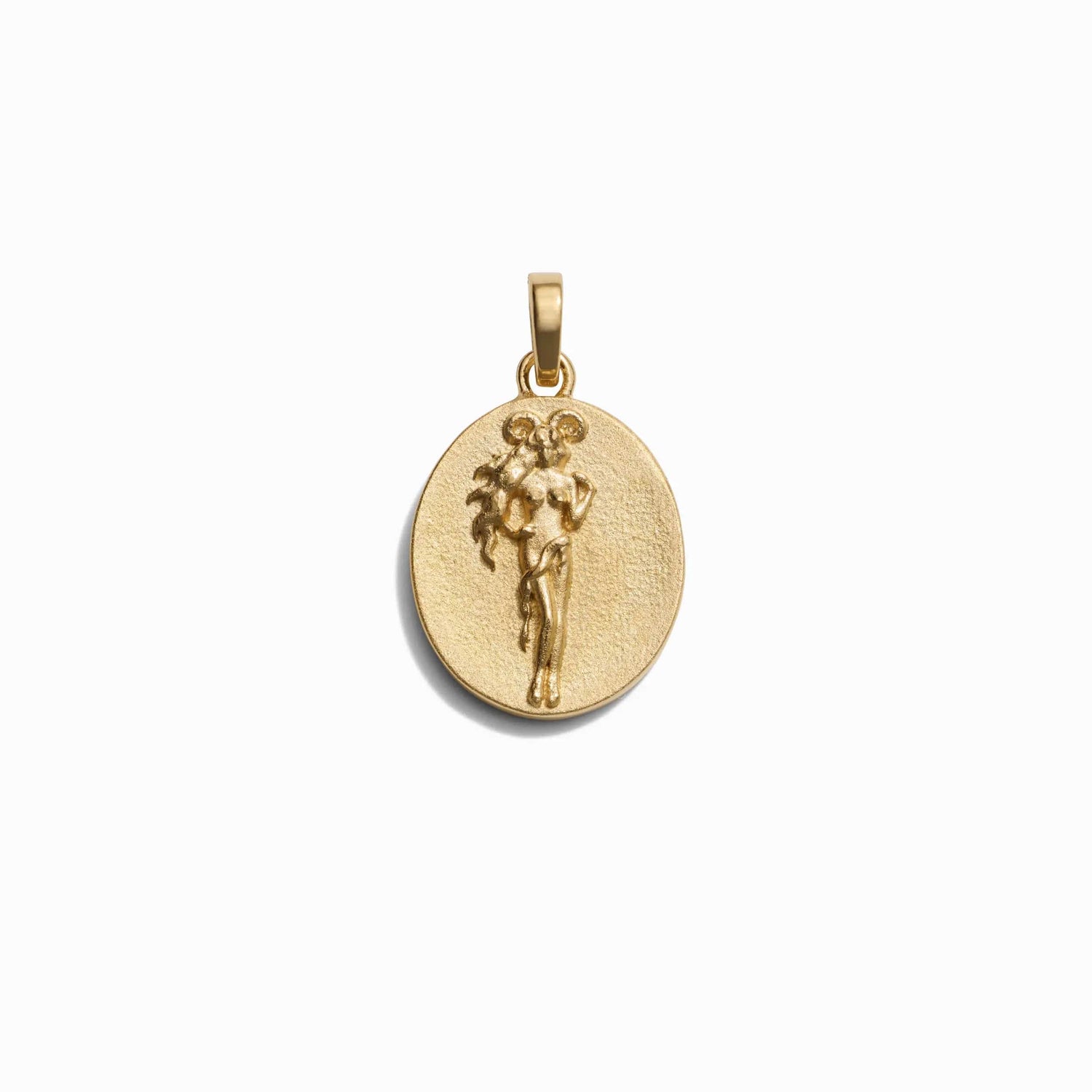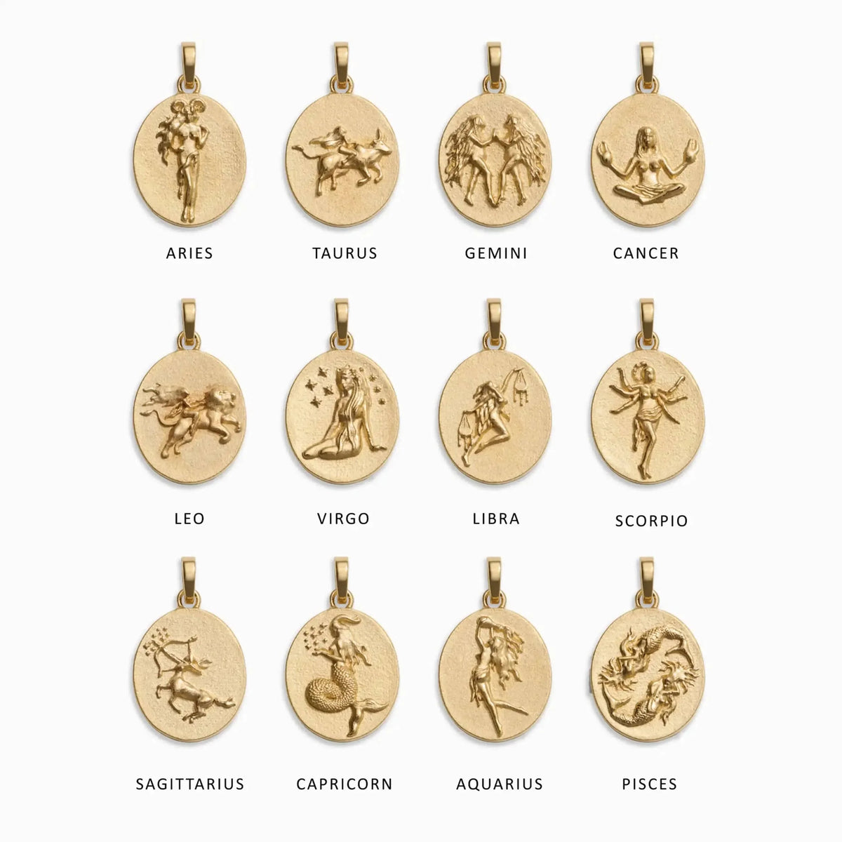 Materials: Handcrafted in 14K yellow gold vermeil, featuring a double-sided oval pendant with zodiac and celestial details.
