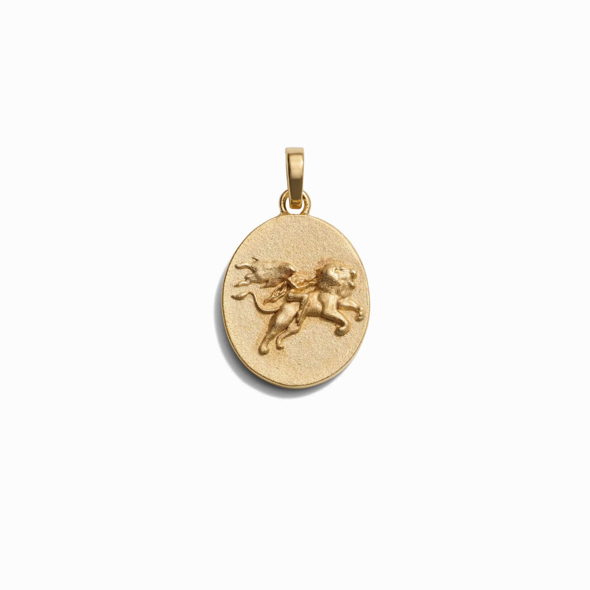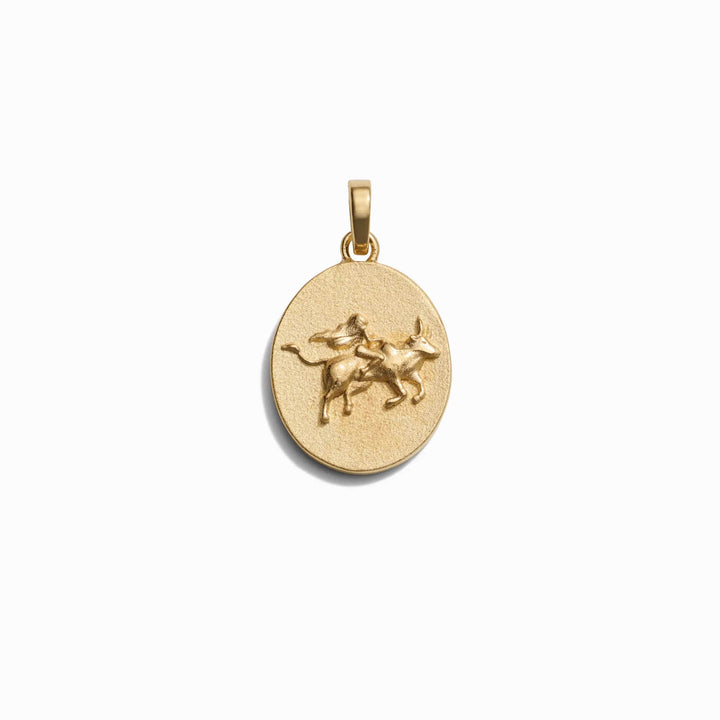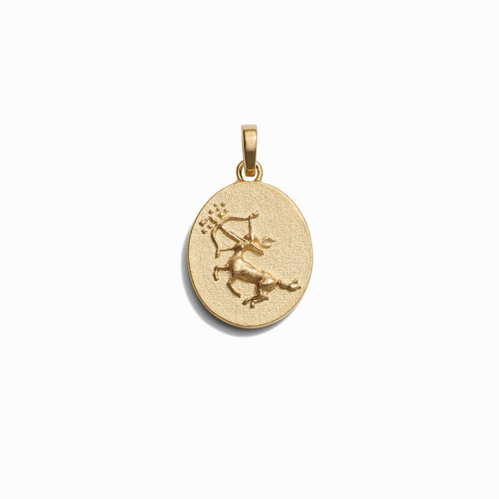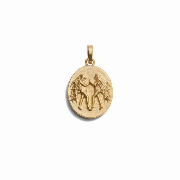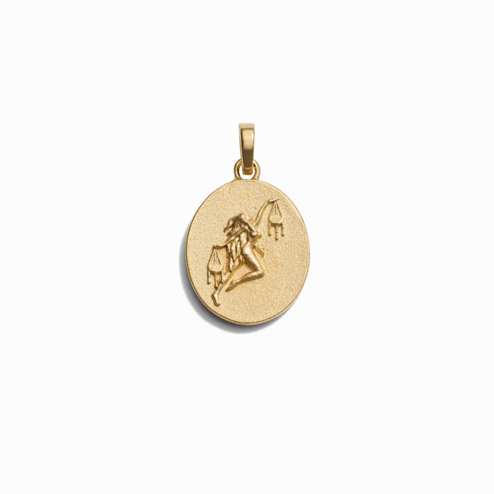Materials: Handcrafted in 14K yellow gold vermeil, featuring a double-sided oval pendant with zodiac and celestial details.
