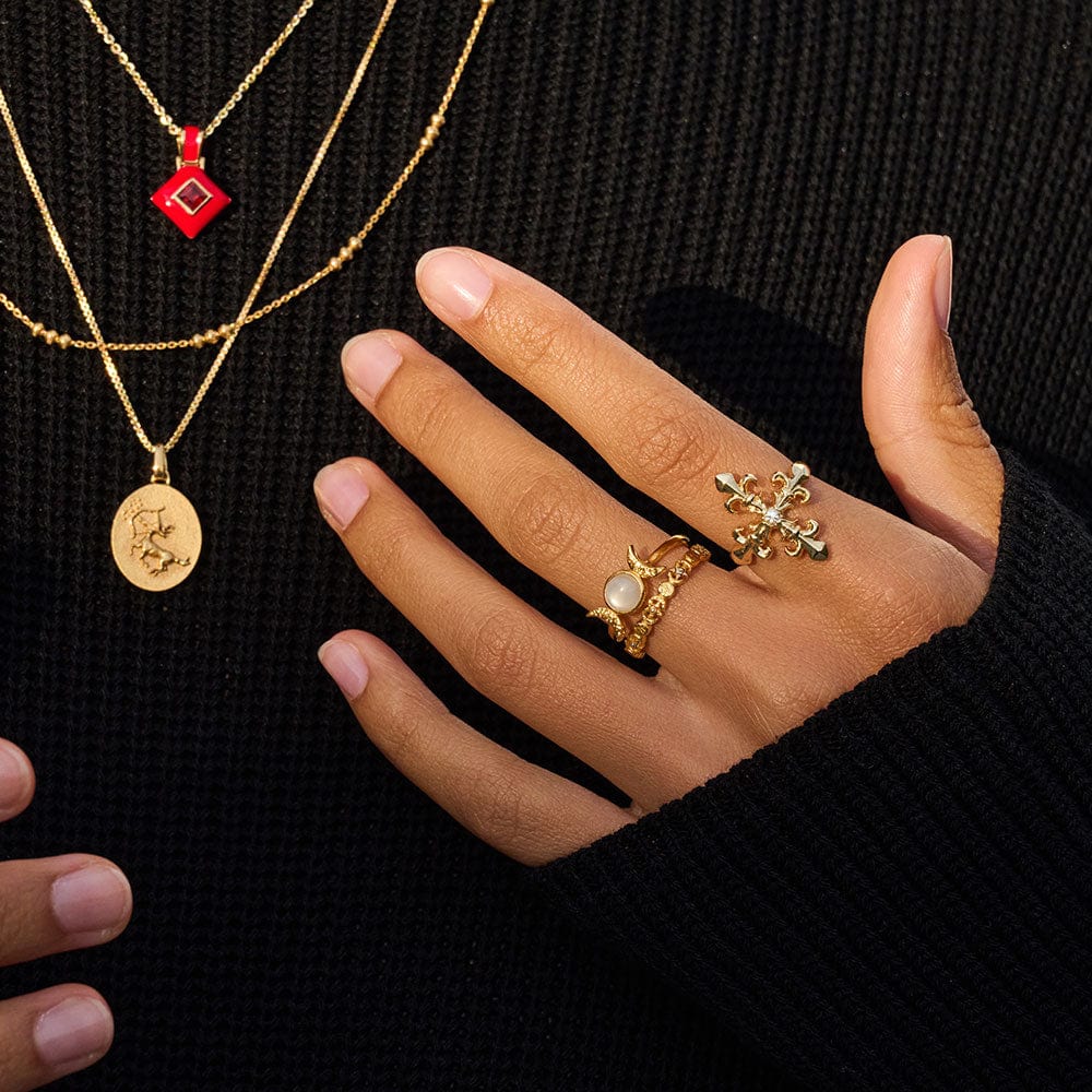 This Diamond-Cut Triple Moon Band by Awe Inspired is perfect for moon lovers and those connected to feminine power. The band’s design, with diamond-cut engraved crescent and full moons, encourages self-discovery and spiritual connection. A dainty yet striking piece for everyday wear.