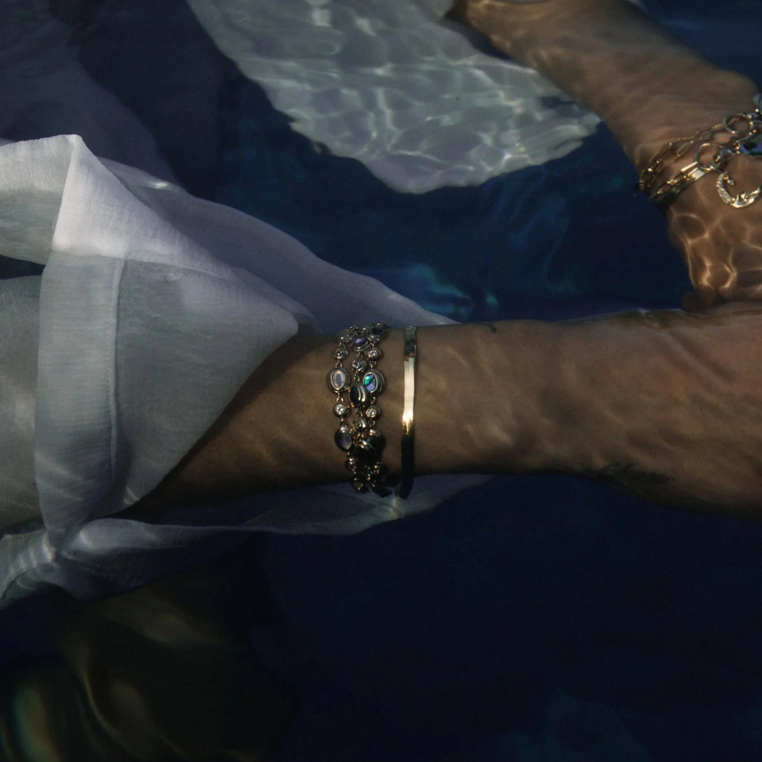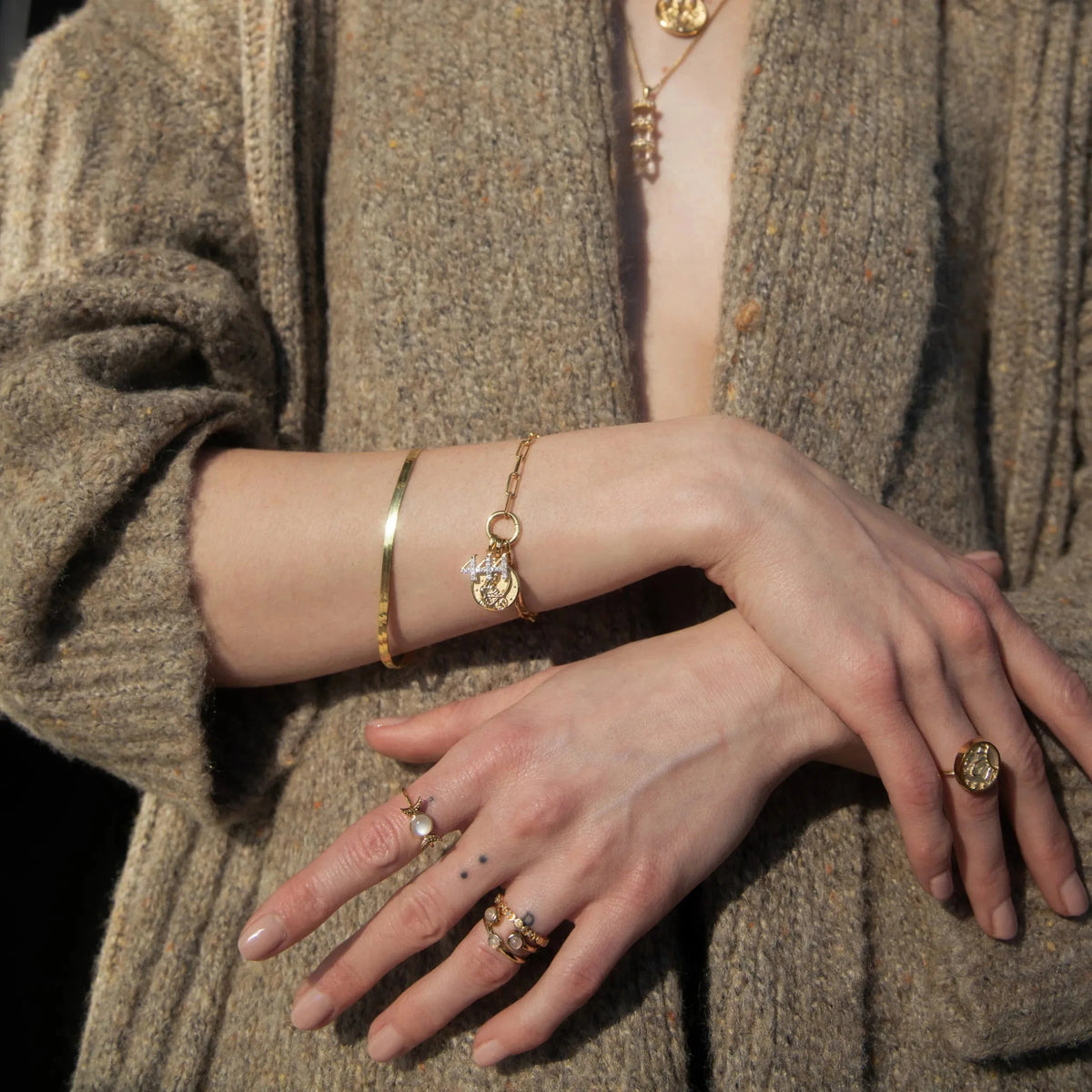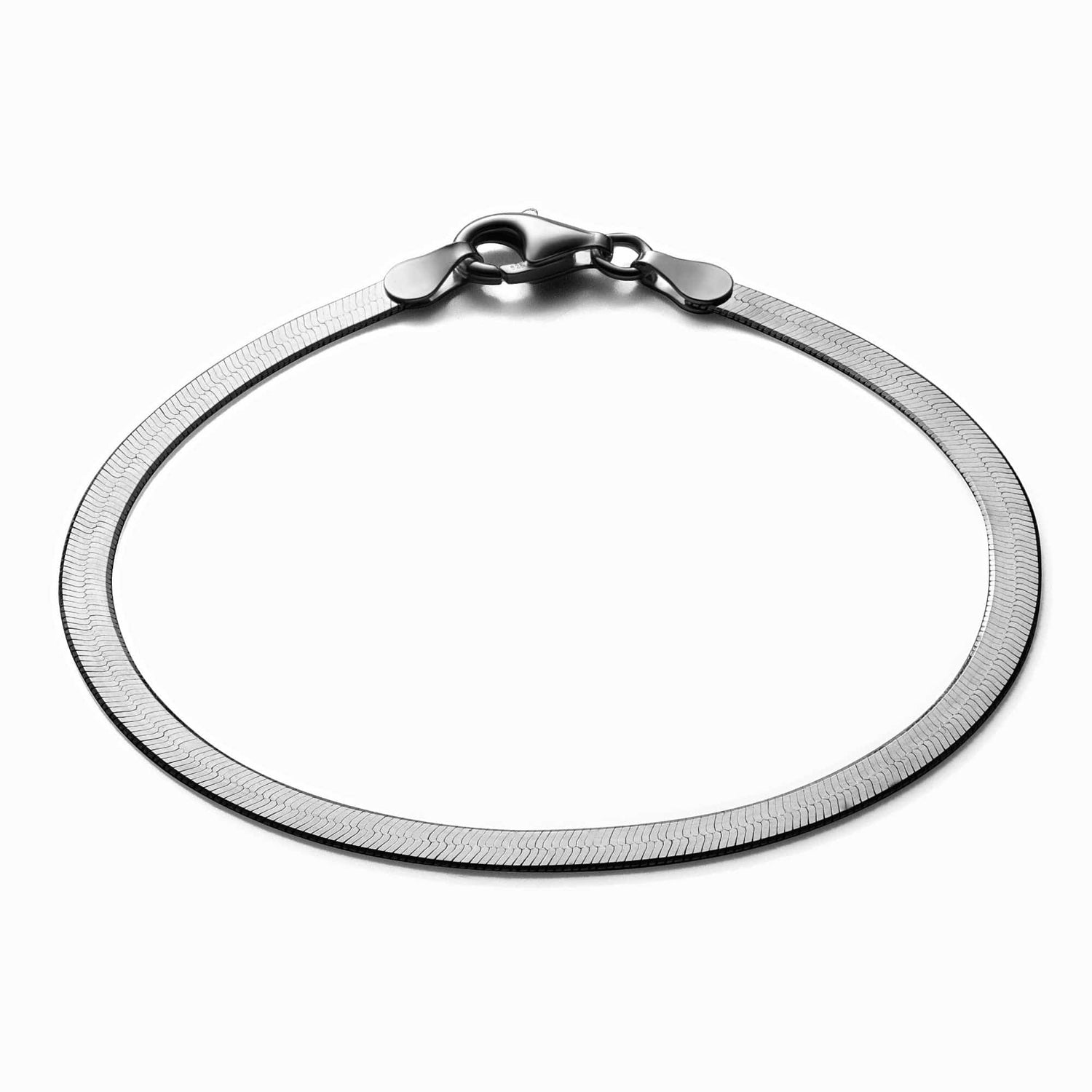 This Herringbone Bracelet by Awe Inspired evokes the glamour of the 70s and 80s with its fluid, flat chain that sparkles with every movement. A statement piece that adds retro luxury to any outfit.