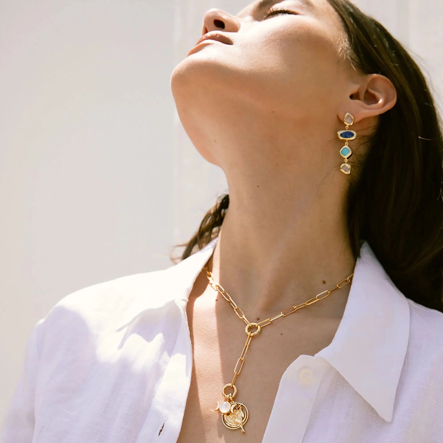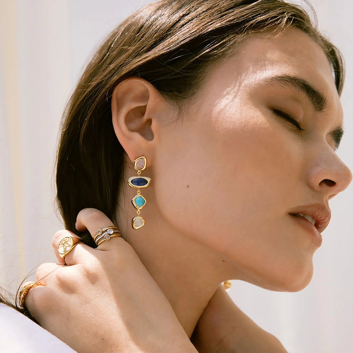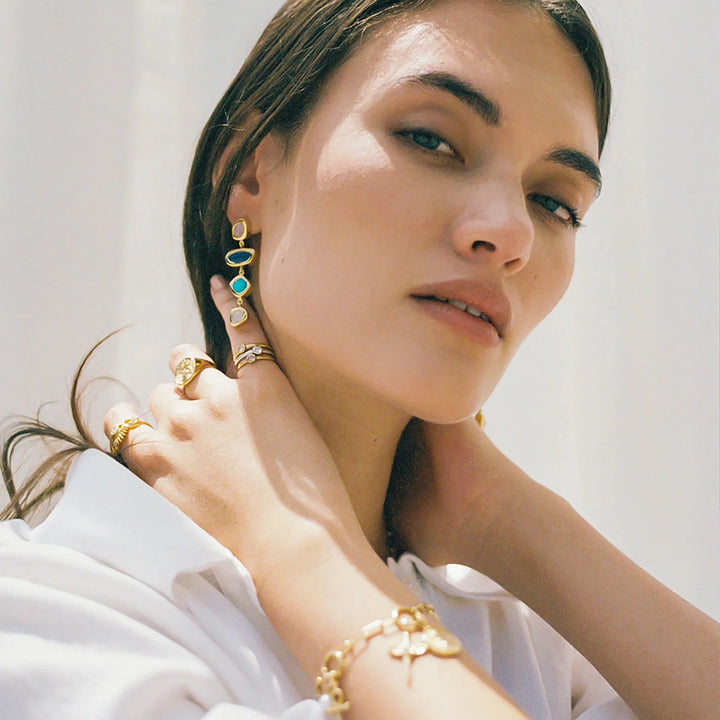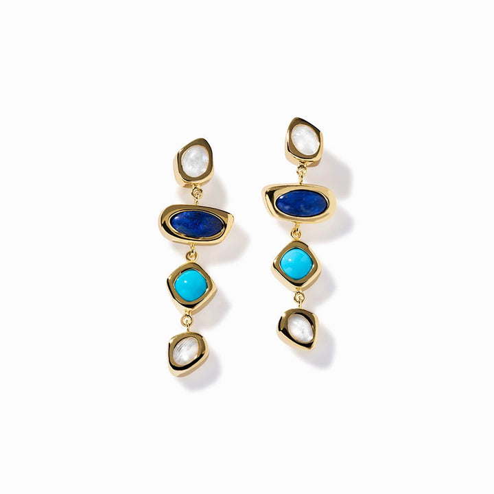 Handcrafted in 14K yellow gold vermeil, featuring lapis lazuli, moonstone, and turquoise.