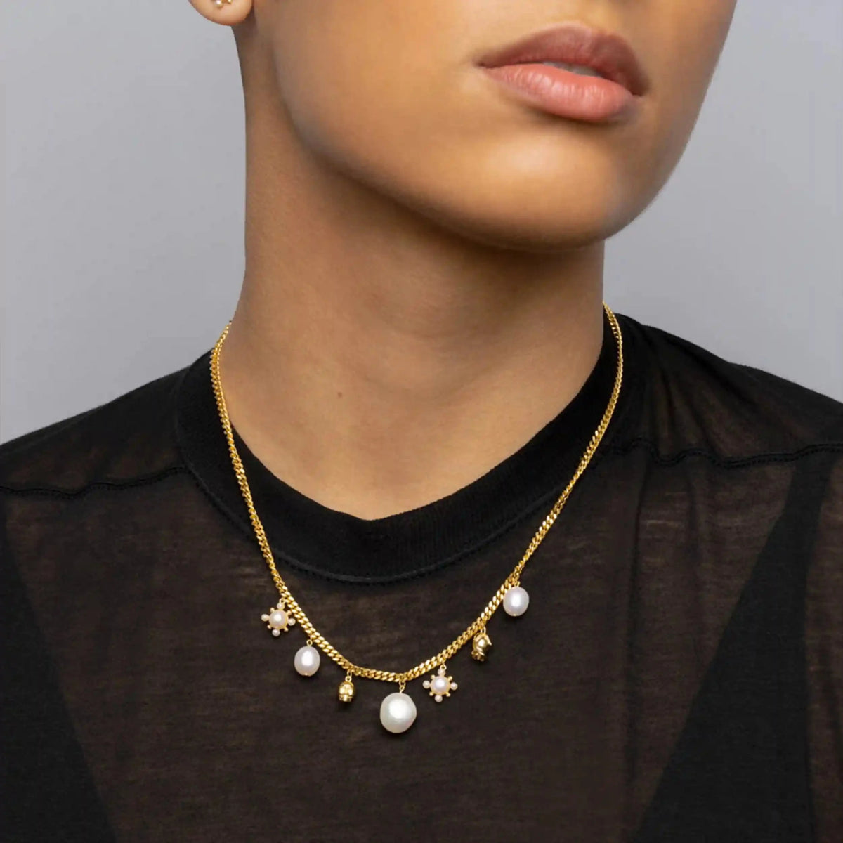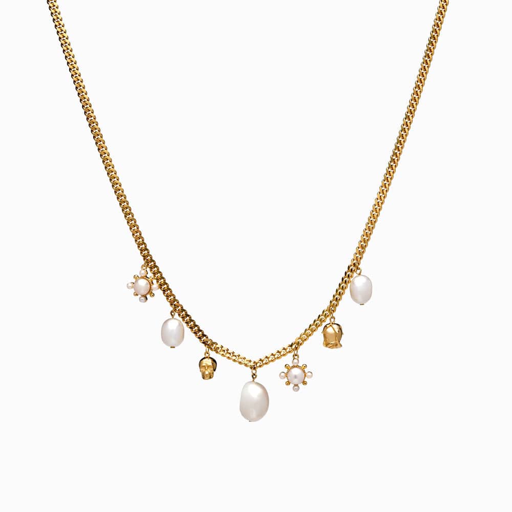 Handcrafted in 14K yellow gold vermeil, featuring pearls, flowers, and skull charms.
