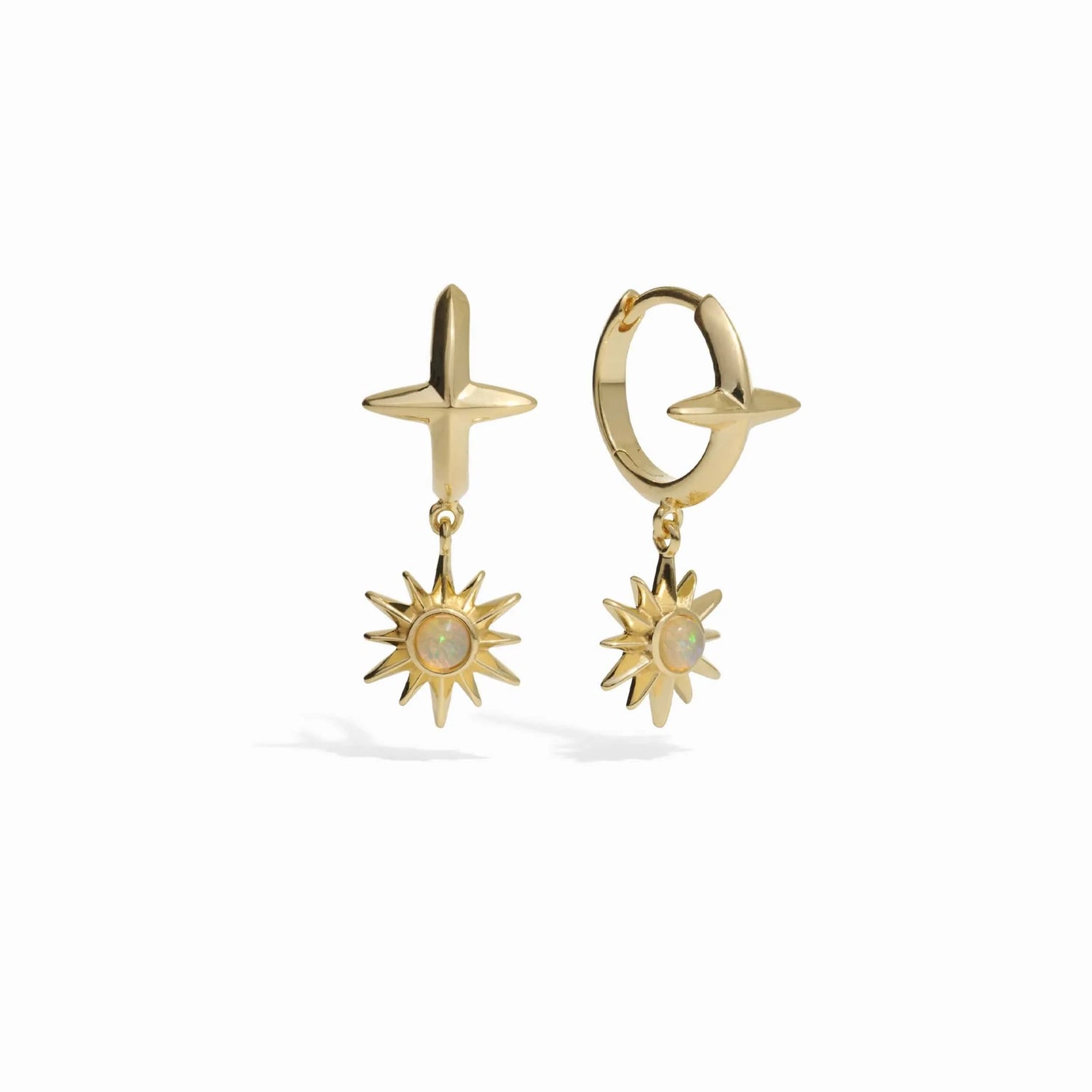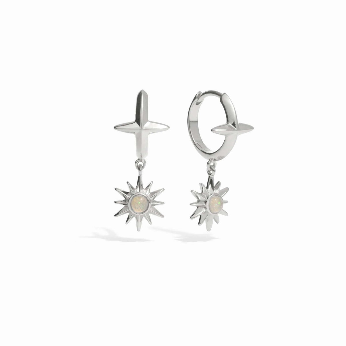 These Opal Solar Huggies by Awe Inspired are lightweight, everyday earrings featuring a genuine white opal that glimmers in the light. Their pop-closure design makes them easy to wear, adding a touch of solar radiance to your look.