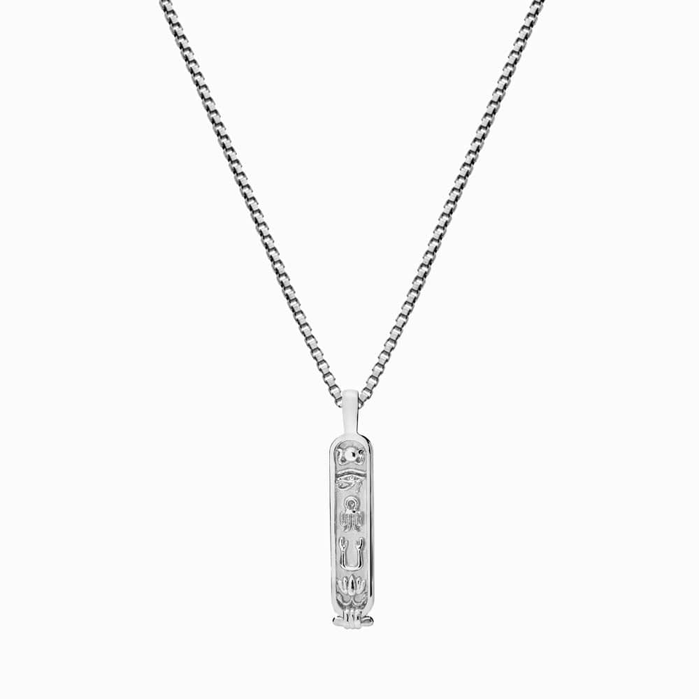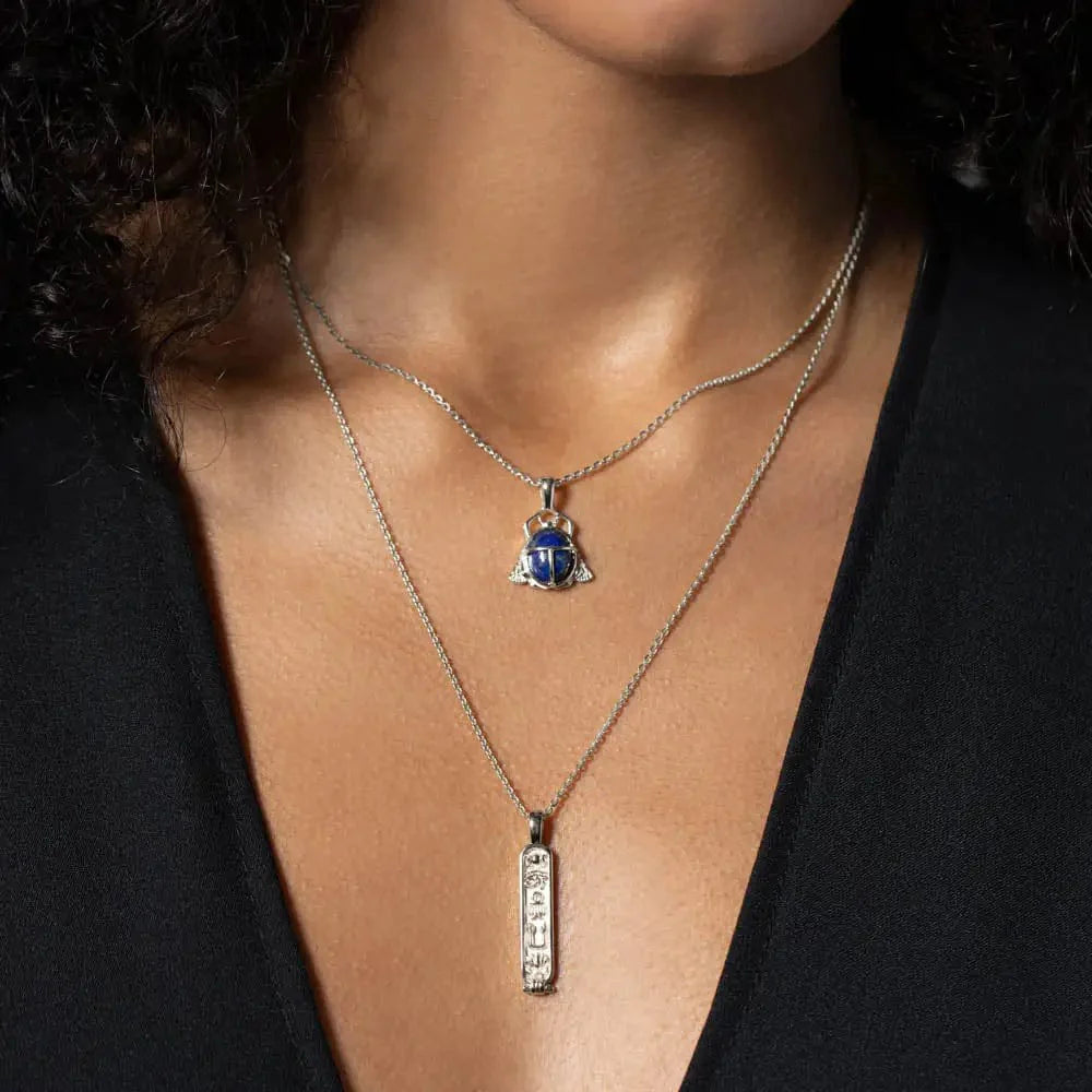Cartouche Necklace by Awe Inspired — A talisman of absolute power, the Cartouche Necklace was traditionally worn by Pharaohs to protect them in life and the afterlife. Intricately detailed with ancient hieroglyphs, this piece envelops the wearer in the magical protection and strength of Egyptian royalty. The symbols inscribed—Uraeus, Eye of Ra, Tyet, Ka, and Lotus—each carry profound meanings, from divine royalty to spiritual awakening and rebirth, making this necklace both meaningful and regal.