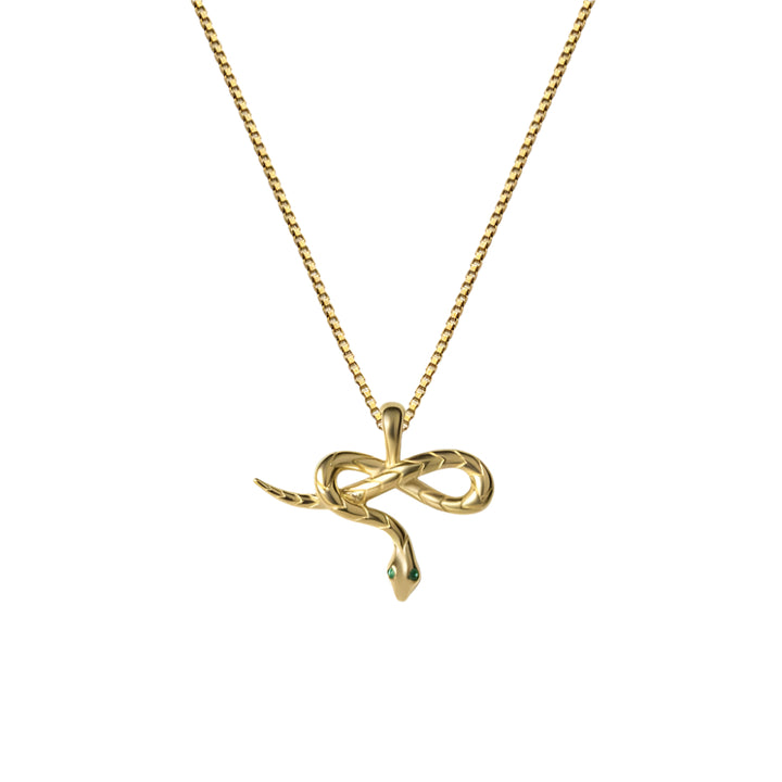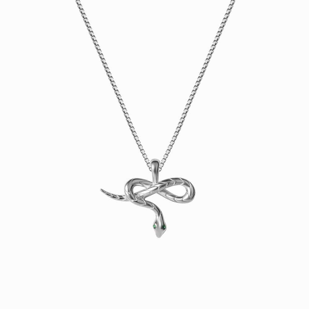 Emerald Eye Snake Necklace by Awe Inspired — The snake, as a spirit animal, symbolizes transformation and renewal. This necklace encourages you to release the past and live in the present, shedding old perceptions like the snake sheds its skin. With striking emerald eyes, the Snake Goddess Charm invites you to embrace new perspectives and a refreshed outlook on life.
