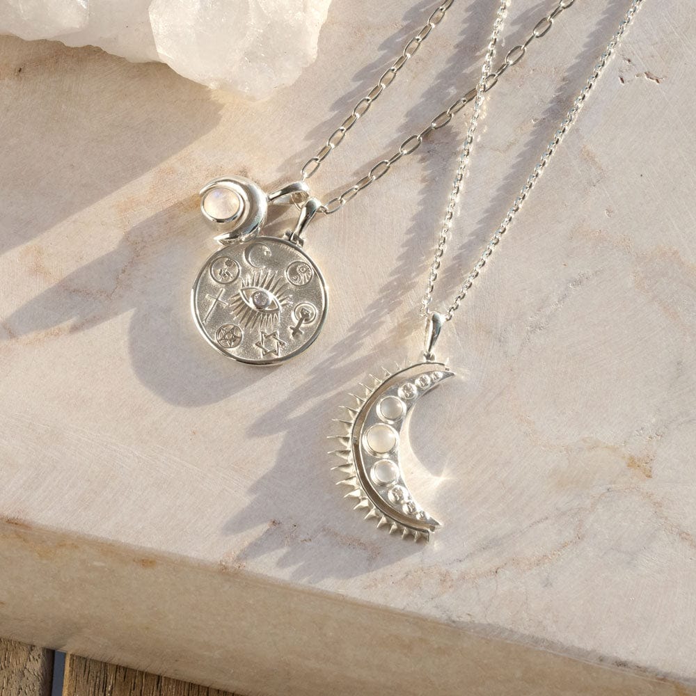 Moonstone Crescent Necklace by Awe Inspired — Known for promoting inner clarity and balance, moonstones help the wearer connect with their intuition. This crescent necklace encourages hope, transformation, and a deeper understanding of the feminine spirit, making it a perfect talisman for new beginnings.