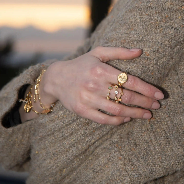 Moonstone Opal Topaz Ring by Awe Inspired — A versatile stacking ring that adds a touch of elegance to your existing collection. This ring can be worn alone or layered, featuring natural white moonstone and sparkling white topaz for a subtle yet stylish look.