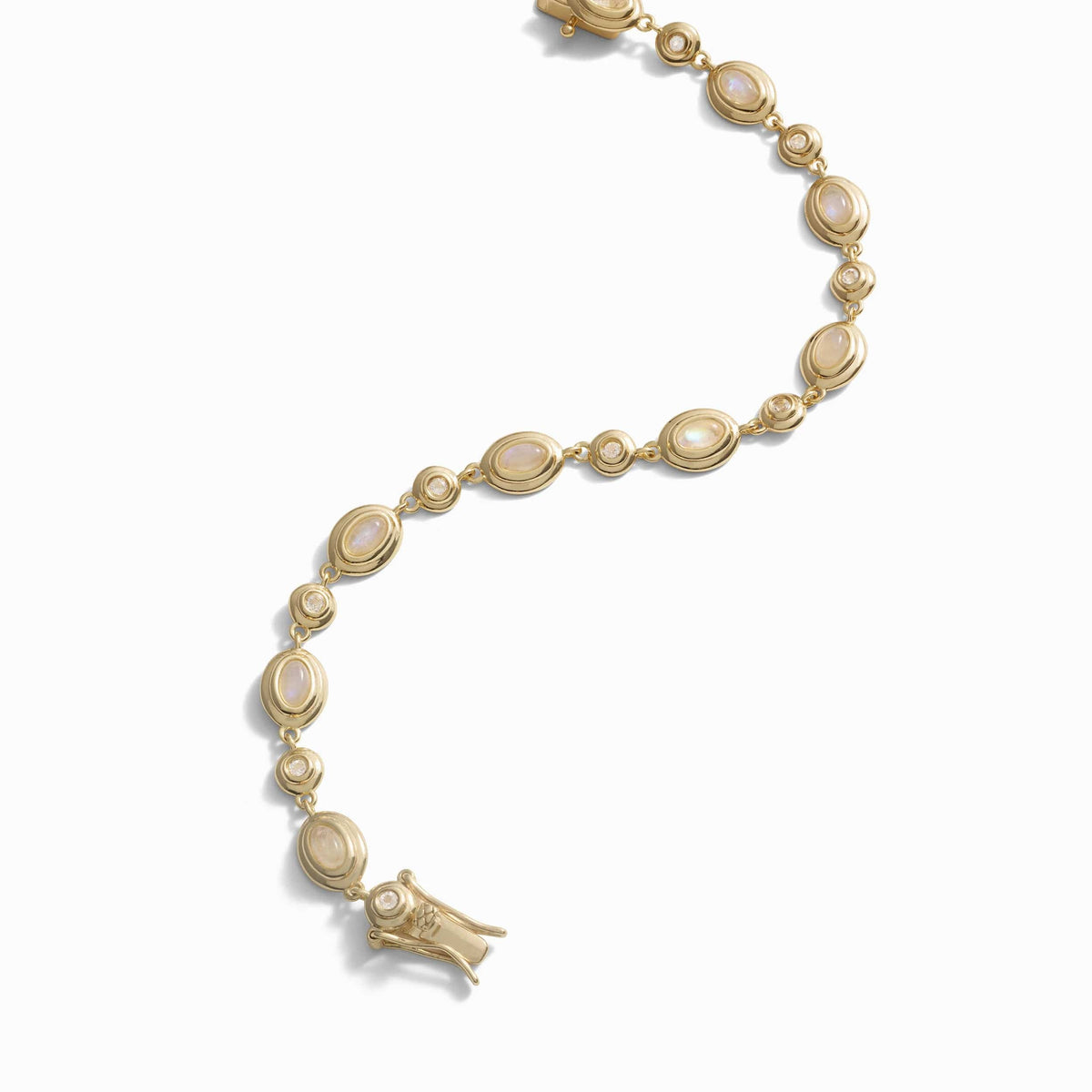 Moonstone Tennis Bracelet by Awe Inspired — A luxurious take on the classic tennis bracelet, featuring moonstone and brilliant white topaz gemstones in individually bezeled settings. Available in two lengths: 6.75 in and 7.35 in, with a secure box clasp and double safety.