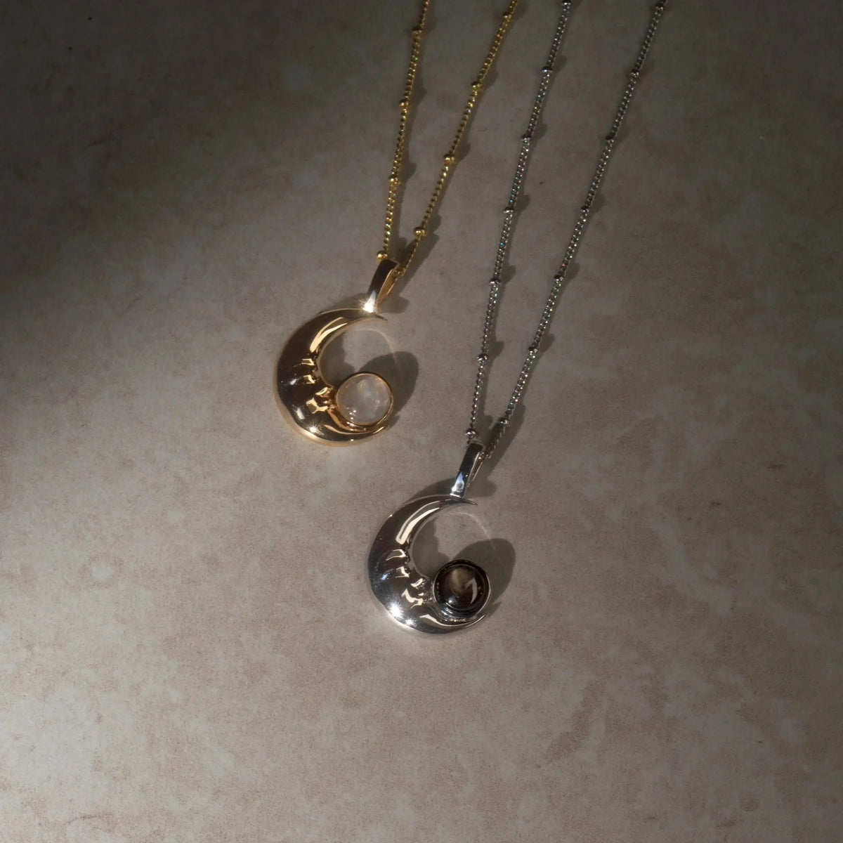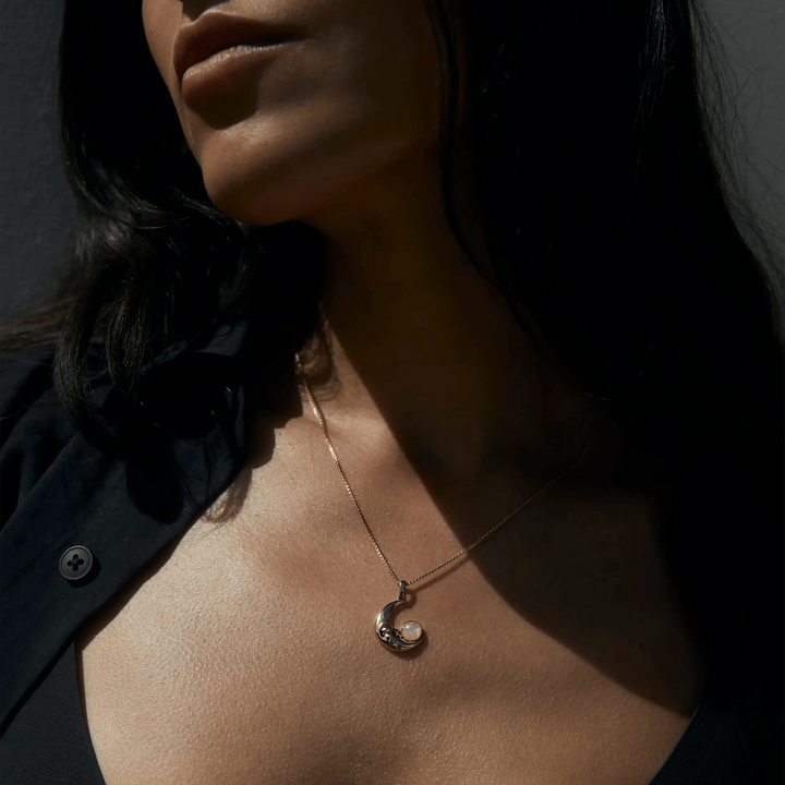 Man in the Moon Moonstone Amulet by Awe Inspired — This amulet embodies humanity's enduring connection to the moon. Featuring a face in the moon made from moonstone, it represents the comforting presence of a loyal companion that you can carry with you wherever you go.