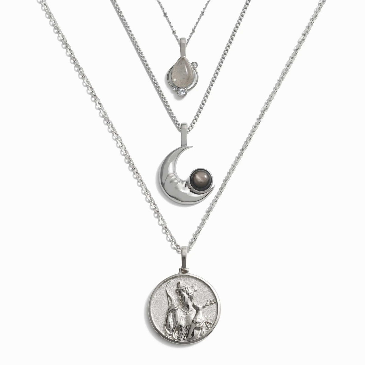 Mistress of the Moon Necklace Set by Awe Inspired — Connect deeply with nature through the Goddess Artemis, protector of the wild and of young girls. This necklace set, with its moonstone amulet, draws beauty and inspiration from the moon, empowering you to roam freely, just like Artemis and her band of huntresses.