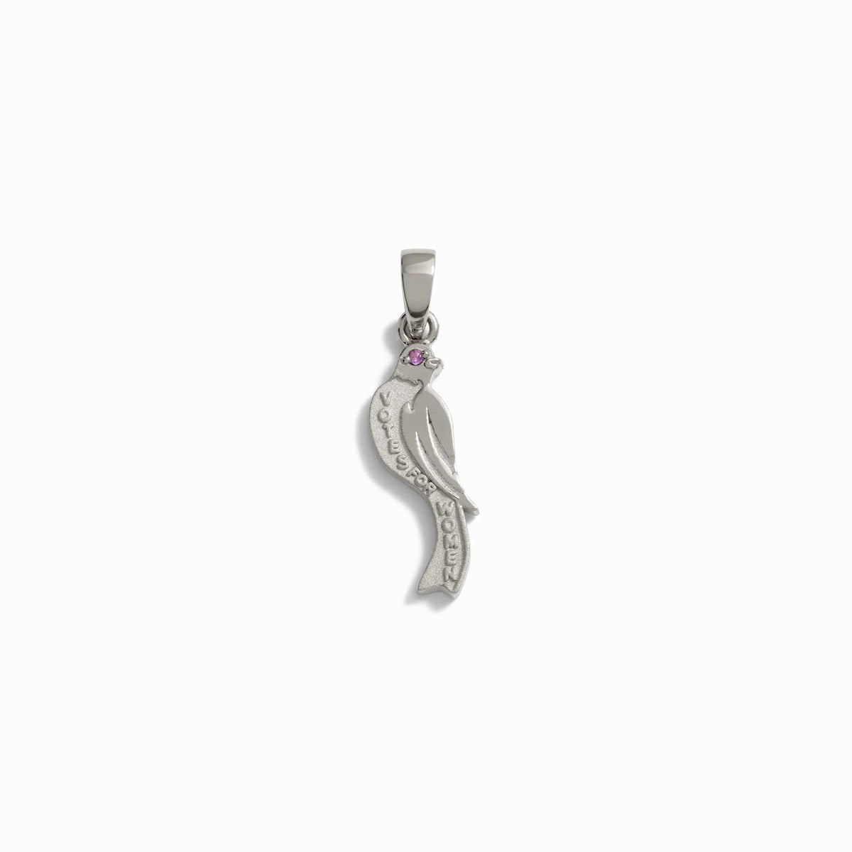 Mini Bluebird Amulet by Awe Inspired — Representing the women’s suffrage movement since the early 1900s, the Bluebird symbolizes women’s voices being heard. This amulet features an eye of sparkling amethyst, representing the Suffragettes' purple color, with the traditional 'Votes For Women' call engraved, reminding you to Rise Up in Awe.