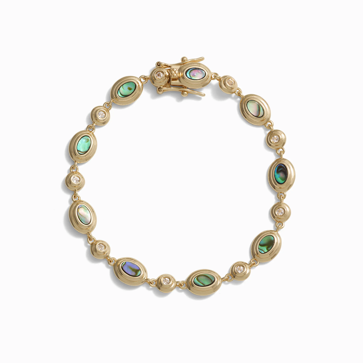 Abalone Tennis Bracelet by Awe Inspired — This luxurious tennis bracelet showcases abalone and white topaz, evoking a connection between sea and sky. Each gemstone is individually bezeled, ensuring secure and stunning wear.