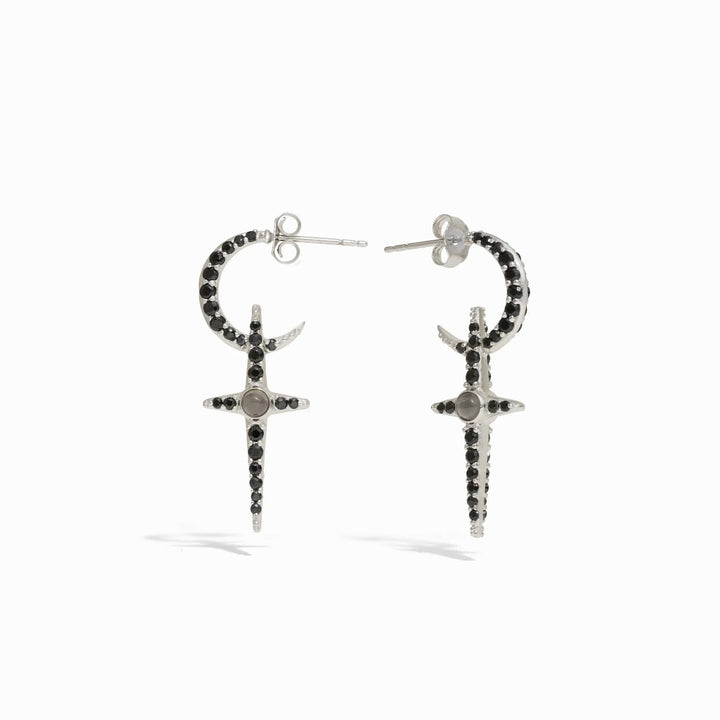 These Grey Moonstone Crescent Cross Hoops by Awe Inspired feature the powerful symbolism of the Black Moon and the Venus cross, signifying the hidden aspects of femininity. Punctuated with shimmering black spinel and a grey moonstone, these hoops combine elegance with a touch of mysticism.