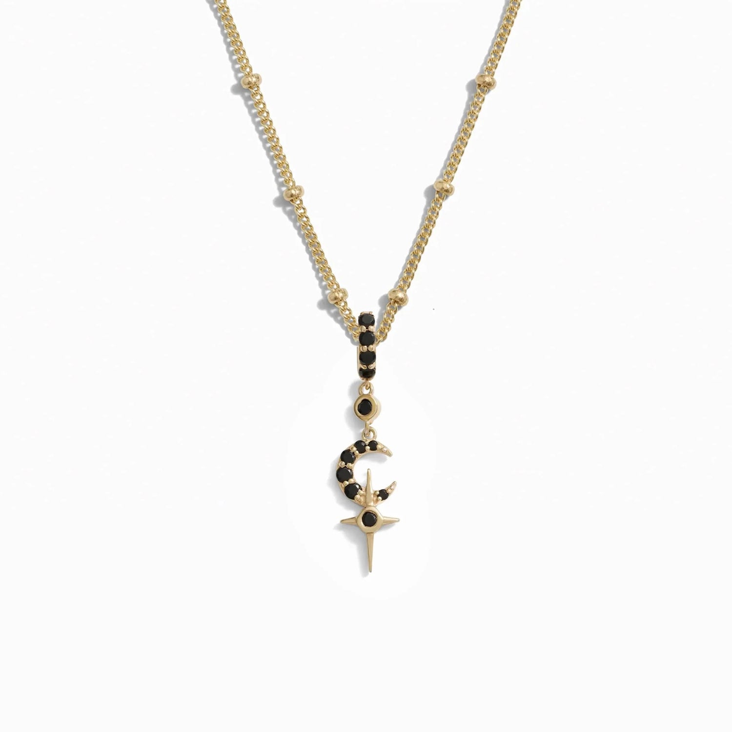 Handcrafted in 14K Yellow Gold Vermeil with black spinel adorning the bale, moon, and cross.