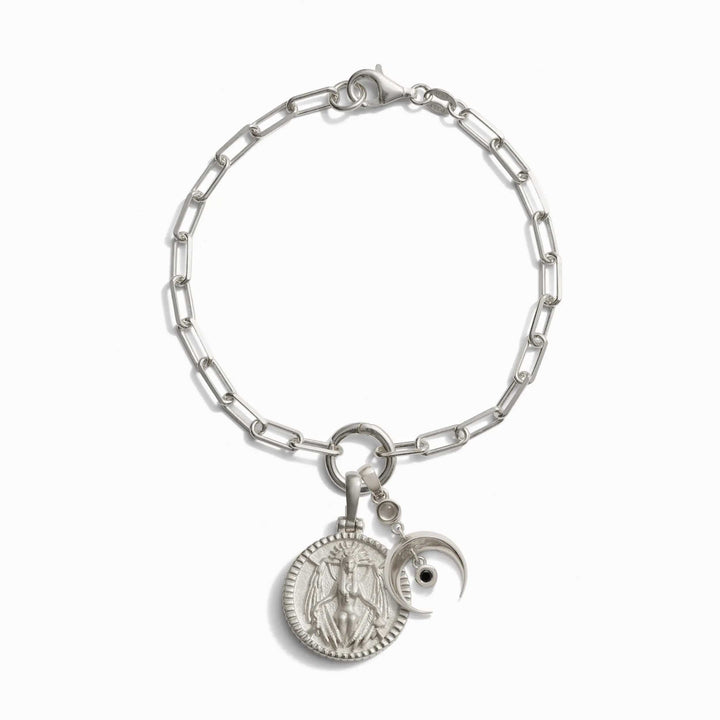 This Inverted Moon Charm Bracelet by Awe Inspired features Lilith’s open wings, symbolizing her rise from banishment and the reclaiming of feminine power. With her unique coin edge and miniature size, this Lilith pendant is perfect for layering on a Charm Collector. A bold, empowering charm for women who walk free of shame.