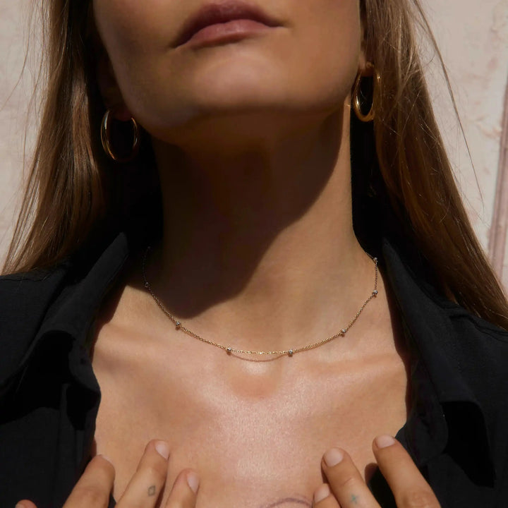 This Diamond Rondelle Necklace by Awe Inspired is a dream made wearable. Genuine diamonds accent the rondelle beads, adding sparkle and elegance to this ethereal necklace. With adjustable jump rings, the length can be customized to 14', 16', or 18', making it perfect for layering with other necklaces.